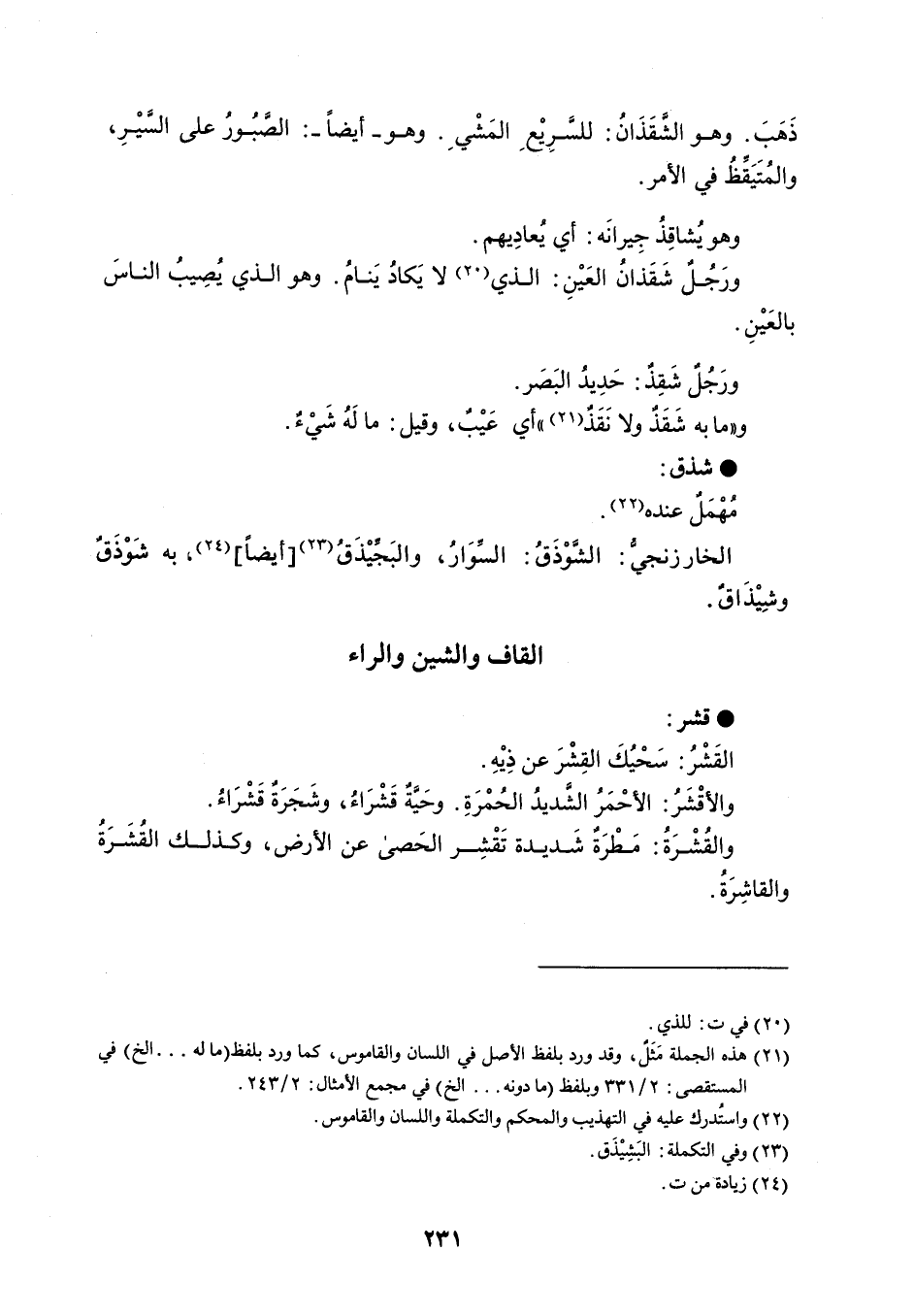 ذهب . وهو الشقذان : للسريع المشي . وهو - أيضاً - : الصبور على السير ، والمتيقظ في الأمر . وهو يُشاقِذُ جِيرانَه : أي يُعادِيهم . ورَجُلٌ شَقَذانُ العَيْنِ : الذي لا يَكادُ يَنامُ . وهو الذي يُصِيبُ الناسَ بالعَيْنِ . ورجل شقذ : حديد البصر . و ' ما به شقذ ولا نقذ ' أي عيب ، وقيل : م اله شيء . شذق مهمل عنده . الخارزنجي : الشوذق : السوار ، والبجيذق أيضاً ، به شوذق وشيذاق .