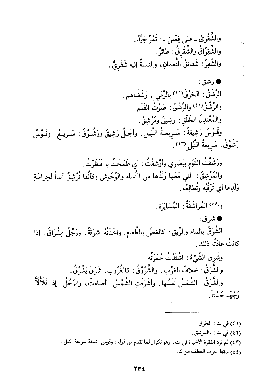 والشِّقْرى - على فِعْلى - : تَمْرٌ جَيدٌ . والشَقِرّاقُ والشِّقْرِقُ : طائر . والشَقِرُ : شَقائقُ النُّعمانِ ، والنسبةُ إليه شَقَرِي . رشق الرَّشْقُ : الخَزْقُ بالرَّمْي ، رَشَقْناهم . والرشْقُ والرشْقُ : صَوْتُ القَلَم . والمُعْتَدِلُ الخَلْقِ : رَشِيقٌ ومُرْشِقٌ . وقَوْس رَشِيقة : سَرِيعةُ النَّبْل . وأجَلٌ رَشِيقٌ ورَشُوْقٌ : سَرِيعٌ . وقَوْسٌ رَشُوْقٌ : سَرِيعةُ النَّبْل . ورَشَقْتُ القَوْمَ ببَصَري وأرْشَقْتُ : أي طَمَحْتُ به فَنَظَرْتُ . والمُرْشِقُ : التي مَعَها وَلَدُها من النِّساء والوُحُوش وكأنَّها تُرْشِقُ أبد الحِراسَةِ وَلَدِها أي تَرْقُبُه وتُطالِعُه . والمُراشَقَةُ : المُسَايَرَة . شرق الشَّرَق بالماء والرِّيق : كالغَصِّ بالطَّعام . وأخَذَتْهُ شَرَقَةٌ . ورَجُلٌ مِشْرَاقٌ : إذا كانتْ عادَتُه ذلك . وشَرِقَ الشَّيْءُ : اشْتدَّتْ حُمْرَتُه . والشَّرْقُ : خِلافُ الغَرْبِ . والشُّرُوْقُ : كالغُرُوب ، شَرَقَ يَشْرُقُ . والشَّرْقُ : الشَّمْسُ نَفْسُها . وأشْرَقَتِ الشَّمْسُ : أضاءتْ ، والرَّجُلُ : إذا تَلألأ وَجْهُه حُسْناً .