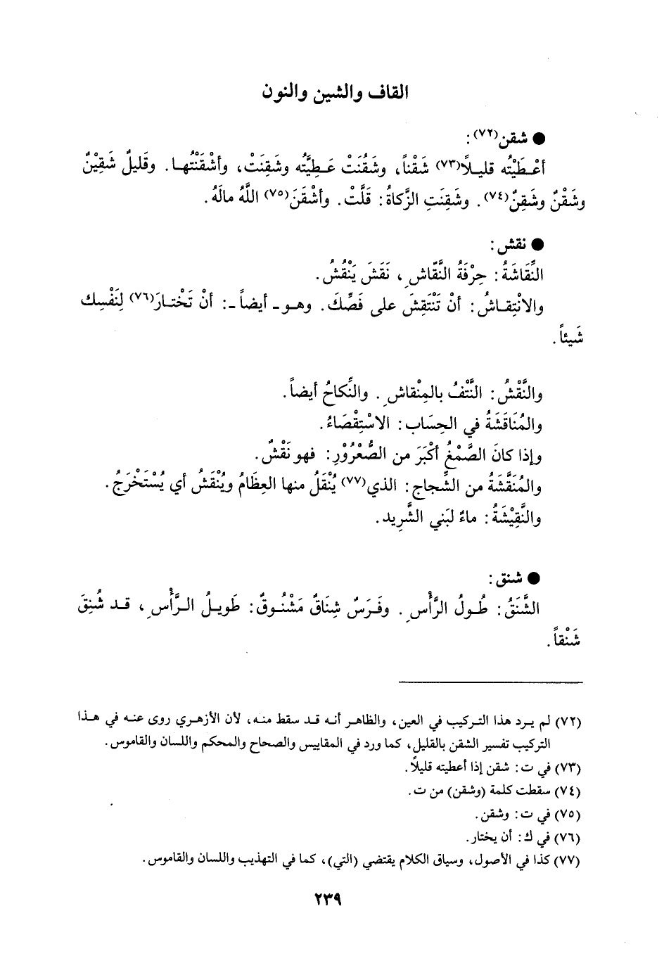 شقن أعْطَيْتُه قليلاً شَقْناً ، وشَقُنَتْ عَطِيَّتُه وشَقِنَتْ ، وأشْقَنْتُها . وقَليلٌ شَقِيْنٌ وشَقْنٌ وشَقِنٌ . وشَقِنَتِ الزِّكاةُ : قَلَّتْ . وأشْقَنَ اللهُ مالَهُ . نقش النِّقَاشَة : حِرْفَةُ النَقّاش ، نَقَشَ يَنْقُشُ . والانْتِقاشُ : أنْ تَنْتَقِشَ على فَصِّكَ . وهو - أيضاً - : أنْ تَخْتارَ لِنَفْسِك شيئاً . والنَّقْشُ : النَّتْفُ بالمِنْقاش . والنِّكاحُ أيضاً . والمُنَاقَشَةُ في الحِسَاب : الاسْتِقْصَاءُ . وإذا كانَ الصَمْغُ أكْبَرَ من الصُّعْرُورِ : فهو نَقْشٌ . والمُنَقَّشَةُ من الشِّجاج : الذي يُنْقَلُ منها العِظَامُ وُينْقَشُ أي يسْتَخْرَج . والنَقِيْشَةُ : ماءٌ لبَني الشَّرِيد . شنق الشَّنَقُ : طُولُ الرأس . وفَرَسٌ شِنَاق مَشْنُوق : طَويلُ الرَّأْس ، قد شُنِقَ شَنْقاً .