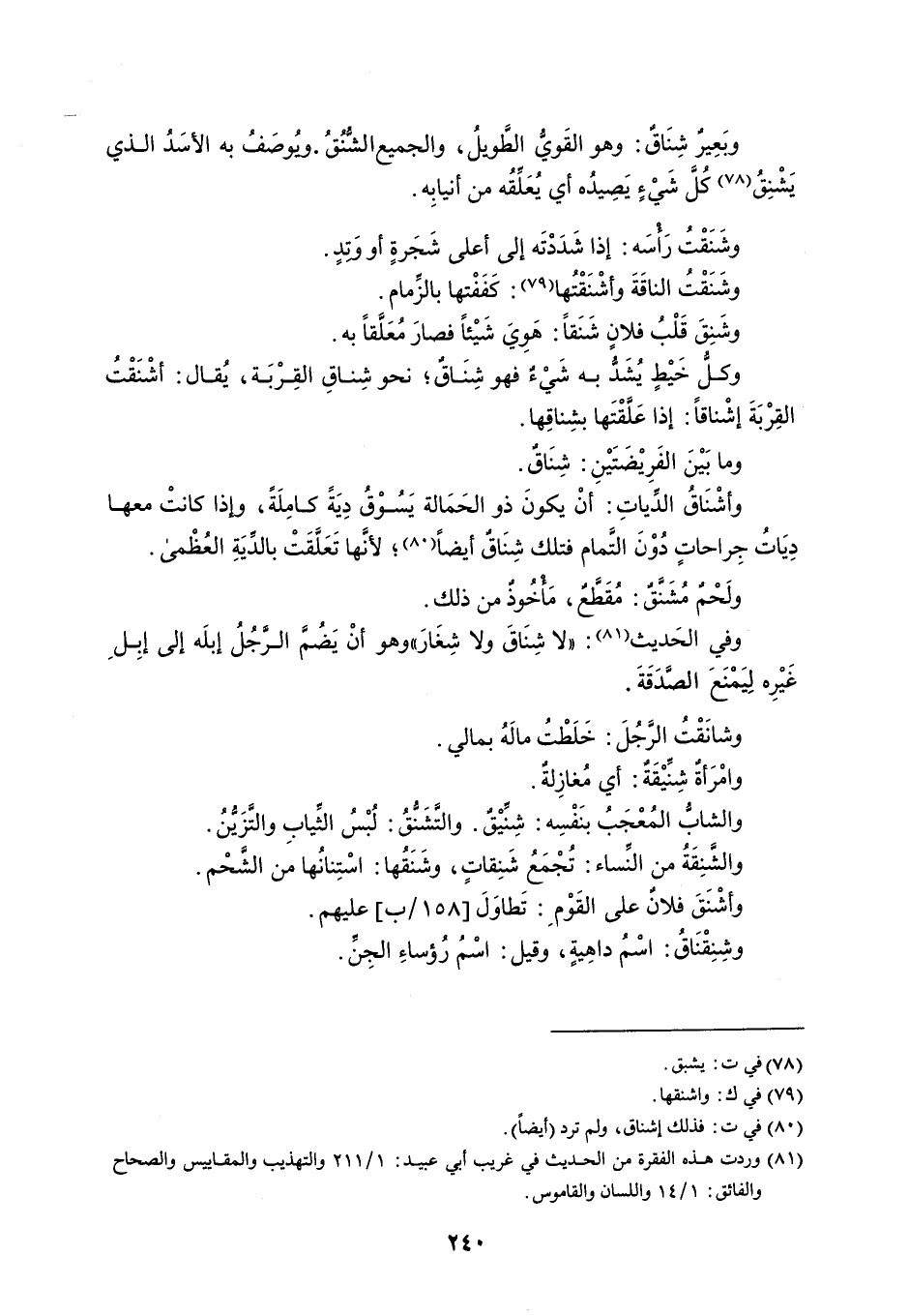 وبَعِيرٌ شِنَاقٌ : وهو القَويُّ الطَّوبلُ ، والجميع الشُنُقُ . ويُوصَفُ به الأسَدُ الذي يَشْنِقُ كُلّ شَيْءٍ يَصِيدُه أي يُعلَقُه من أنيابِه . وشَنَقْتُ رَأْسَه : إذا شَدَدْتَه إلى أعلى شَجَرةٍ أو وَتدٍ . وشَنَقْتُ الناقَةَ وأشْنَقْتُها : كَفَفْتها بالزِّمام . وشَنِقَ قَلْبُ فلانٍ شَنَقاً : هَوِيَ شَيْئاً فصار مُعَلَّقاً به . وكلُّ خَيْطٍ يُشَذُ به شَيْءٌ فهو شِنَاقٌ ، نحو شِناقِ القِرْبَة ، يُقال : أشْنَقْتُ القِرْبَةَ إشْناقاً : إذا عَلَّقْتَها بشِناقِها . وما بَيْنَ الفَرِيْضتَيْنِ : شِنَاقٌ . وأشْنَاقُ الدِّياتِ : أنْ يكونَ ذو الحَمَالة يَسُوْقُ دِيَةً كامِلَةً ، وإذا كانتْ معها دِيَاتُ جِراحاتٍ دونَ التَّمام فتلك شِنَاقٌ أيضاً ؛ لأنَّها تَعَلَّقَتْ بالدِّيَةِ العُظْمى . ولَحْمٌ مُشَنَّقٌ : مُقَطَّعٌ ، مَأْخُوذٌ من ذلك . وفي الحَديث : ' لا شِنَاقَ ولا شِغَارَ ' وهو أنْ يَضُمَّ الرَّجُلُ إبلَه إلى إبِل غَيْرِه لِيَمْنَعَ الصَدَقَةَ . وشانَقْتُ الرًجُلَ : خَلَطْتُ مالَهُ بمالي . وامْرَأةٌ شِنِّيْقَةٌ : أي مُغازِلةٌ . والشابُّ المُعْجَبُ بنَفْسِه : شِنِّيْقٌ . والتَّشَنُّقُ : لُبْسُ الثِّيابِ والتَّزَيُّنُ . والشَّنِقَةُ من النِّساء : تُجْمَعُ شَنِقاتٍ ، وشَنَقُها : اسْتِنانُها من الشَّحْم . وأشْنَقَ فلانٌ على القَوْم : تَطاوَلَ عليهم . وشِنِقْنَاقُ : اسْمُ داهِيةٍ ، وقيل : اسْمُ رُؤساءِ الجِنِّ .