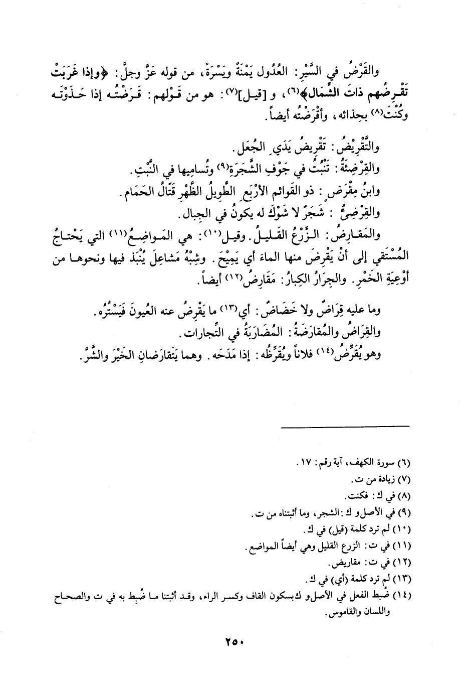 والقَرْضُ في السَّيْرِ : العُدُول يَمْنَةً ويَسْرَةً ، من قوله عًزّ وجلَّ : ' وإذا غَرَبَتْ تَقْرِضُهم ذاتَ الشِّمَال ' و قيل : هو من قَوْلهم : قَرَضْتُه إذا حَذَوْتَه وكُنْتَ بحِذائه ، وأقْرَضْتُه أيضاً . والتَّقْرِيْضُ : تَقْرِيضُ يَدَي الجُعَل . والقِرْضِئَةُ : تَنْبُتُ في جَوْفِ الشَّجَرَةِ وتُسامِيها في النَّبْتِ . وابنُ مِقْرَضٍ : ذو القَوائم الأرْبَع الطَّوِيلُ الظَّهْرِ قَتّالُ الحَمَام . والقِرْضِئُ : شَجَرٌ لا شَوْكَ له يكونُ في الجِبال . والمَقارِضُ : الزَّرْعُ القَليلُ . وقيل : هي المَواضِعُ التي يَحْتاجُ المُسْتَقي إلى أنْ يَقْرِضَ منها الماءَ أي يَمِيْحَ . وشِبْهُ مَشاعِلَ يُنْبَذ فيها ونحوها من أوْعِيَةِ الخَمْرِ . والجِرَارُ الكِبارُ : مَقَارِضُ أيضاً . وما عليه قِرَاضٌ ولا خَضَاضٌ : أي ما يَقْرِضُ عنه العُيونَ فَيَسْتُرُه . والقِرَاضُ والمُقارَضَةُ : المُضَارَبَةُ في التِّجارات . وهو يُقَرِّضُ فلاناً ويُقَرِّظُه : إذا مَدَحَه . وهما يَتَقارَضانِ الخَيْرَ والشَرَّ .