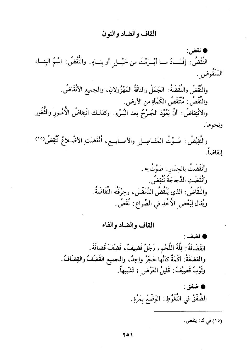 قضف القَضَافَةُ : قلَةُ اللَحْم ، رَجُل قَضِيفُ ، قَضُفَ قَضافَةً . والقَضَفَةُ : أكَمَةٌ كأنها حَجَرٌ واحِدٌ ، والجميع القَضَفُ والقِضَافُ . وثَوْبٌ قَضِيْفٌ : قَليلُ العَرْض ؛ تَشْبيهاً . ضفق الضَّفْقُ في التَّغَوُّطِ : الوَضْعُ بِمَرةٍ .