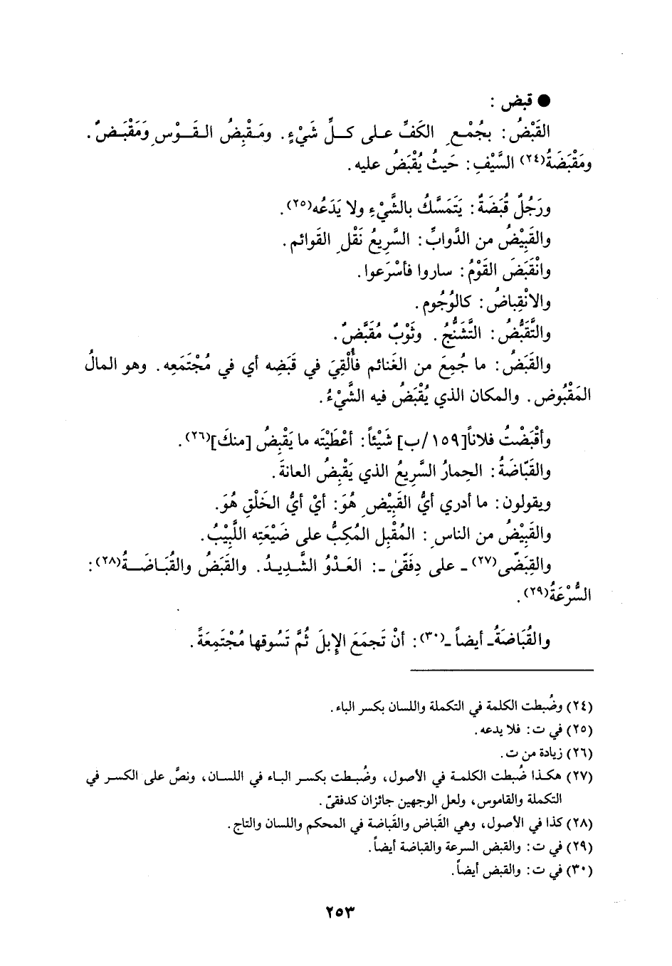 قبض القَبْضُ : بجُمْع الكَف على كل شَيْءٍ . ومَقْبِضُ القَوْس ومقبض . ومَقْبَضَةُ السَّيْفِ : حَيثُ يُقْبَضُ عليه . ورَجُلٌ قُبَضَةٌ : يَتَمَسَّكُ بالشَّيْءِ ولا يَدَعُه . والقَبِيْضُ من الدَّوابِّ : السَّرِيعُ نَقْل القَوائم . وانْقَبَضَ القَوْمُ : ساروا فأسْرَعوا . والانْقِباضُ : كالوُجُوم . والتَّقَبضُ : التَشنجُ . وثَوْب مُقَبَّضٌ . والقَبَضُ : ما جُمِعَ من الغَنائم فألْقِيَ في قَبَضِه أي في مُجْتَمَعِه . وهو المالُ المَقْبُوض . والمكان الذي يُقْبَضُ فيه الشَيْءُ . وأقْبَضْتُ فلاناً شَيْئاً : أعْطَيتَه ما يَقْبِضُ منكَ . والقَبّاضَةُ : الحِمارُ السرِيعً الذي يَقْبض العانةَ . ويقولون : ما أدري أيُ القَبِيْض هُوَ : أيْ أيُ الخَلْقِ هُوَ . والقَبِيْضُ من الناس : المُقْبِل المُكِبُّ على ضَيْعَتِه اللَبِيْبُ . والقِبَضّى - على دِفَقّى - : العَدْوُ الشَّدِيدُ . والقَبَضُ والقُبَاضَةُ : السرْعَةُ . والقُبَاضَةُ - أيضاً - : أنْ تَجمَعَ الإبلَ ثُم تَسُوقها مُجْتَمِعَةً .
