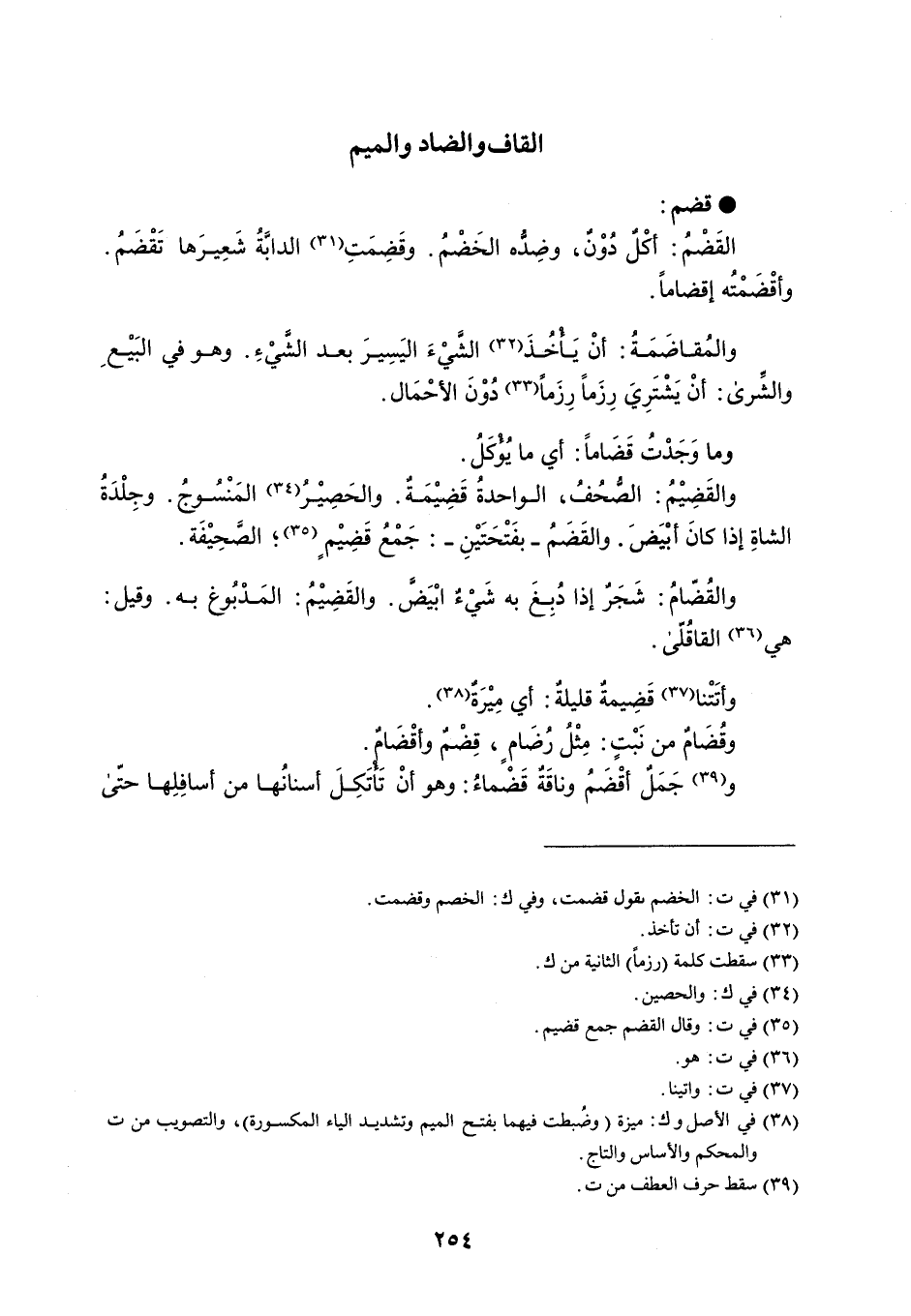 قضم القَضْمُ : أكْلٌ دوْنٌ ، وضِدُّه الخَضْمُ . وقَضِمَتِ الدابَّةُ شَعِيرَها تَقْضمُ . وأقْضَمْتُه إقضاماً . والمُقاضَمَةُ : أنْ يأخذ الشَّيْءَ اليَسِيرَ بعد الشَّيْءِ . وهو في البَيْع والشِّرى : أنْ يَشْتَرِيَ رِزَماً رِزَماً دُوْنَ الأحْمَال . وما وَجَدْتُ قَضَاماً : أي ما يُؤْكَل . والقَضِيْمُ : الصُّحُفُ ، الواحدةُ قَضِيْمَةٌ . والحَصِيْرُ المَنْسُوجُ . وجِلْدَةُ الشاةِ إذا كانَ أبْيَضَ . والقَضَمُ - بفَتْحَتَيْنِ - : جَمْعُ قَضِيْمٍ ؛ الصَّحِيْفَة . والقُضّامُ : شَجَرٌ إذا دُبِغَ به شَيْءٌ ابْيَضَّ . والقَضِيْمُ : المَدْبُوغ به . وقيل : هي القاقُلّى . وأتَتْنا قَضِيمة قليلةٌ : أي مِيْرَة . وقُضَامٌ من نَبْتٍ : مِثْلُ رُضَام ، قِضْم وأقْضَامٌ . وجَمَلٌ أقْضَمُ وناقَة قَضماءُ : وهو أنْ تَأتَكِلَ أسنانُها من أسافِلِها حتّى