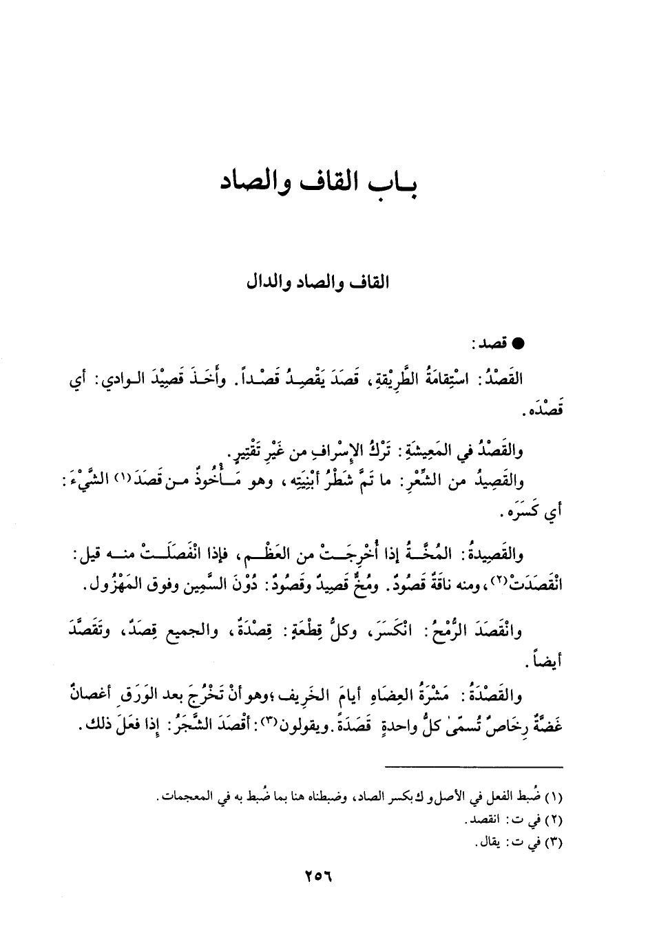 قصد القَصْدُ : اسْتِقامَةُ الطَّرِيْقةِ ، قَصَدَ يَقْصِدُ قَصْداً . وأخَذَ قَصِيْدَ الوادي : أي قَصْدَه . والقَصْدُ في المَعِيشَةِ : تَرْكُ الإِسْرافِ من غَيْرِ تَقْتِيرٍ . والقَصِيدُ من الشَعْرِ : ما تَمَ شَطْرُ أبْنِيَته ، وهو مأخوذ من قَصَدَ الشَيْءَ : أي كَسَرَه . والقَصِيدةُ : المُخَةُ إذا أخْرِجَتْ من العَظْم ، فإذا انْفَصَلَتْ منه قيل : انْقَصَدَتْ ، ومنه ناقَةٌ قَصُودٌ . ومُخُّ قَصِيدٌ وقَصُودٌ : دُوْنَ السَّمِين وفوق المَهْزُول . وانْقَصَدَ الرُّمْحُ : انْكَسَرَ ، وكل قِطْعَةٍ : قِصْدَة ، والجميع قِصَدٌ ، وتَقصَدَ أيضاً . والقَصدةُ : مَشْرَةُ العِضَاهِ أيامِ الخَرِيف وهو أنْ تَخْرُجَ بعد الوَرَقِ أغصان غَضةٌ رِخَاصٌ تُسمّى كل واحدةٍ قَصَدَة . ويقولون : أقْصَدَ الشَّجَرُ : إِذا فعَلَ ذلك .