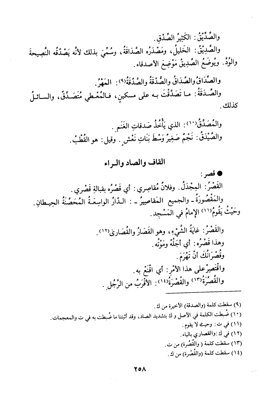 قصر القَصْرُ : المِجْدَلُ . وفلان مُقاصِري : أي قَصْرُه بقبالةِ قَصْري . والمَقْصًورَةُ - والجميع المَقاصِيرُ - : الدّارُ الواسِعَةُ المُحَصنَةُ الحِيطانِ . وحَيْثُ يَقُومُ الإِمامُ في المَسْجِد . والقَصْرُ : غايَةُ الشَّيْءِ ، وهو القَصارُ والقُصَارى . وهذا قَصْرُه : أي أجَلُهُ ومَوْتُه . وقُصْرَانُكَ أنْ تَهْرَمَ . واقْتَصِرْ على هذا الأمْرِ : أي أقْنَعْ به . والقُصُرَة والقُصْرَةُ : الأقرَبُ من الرَّجُلَ .