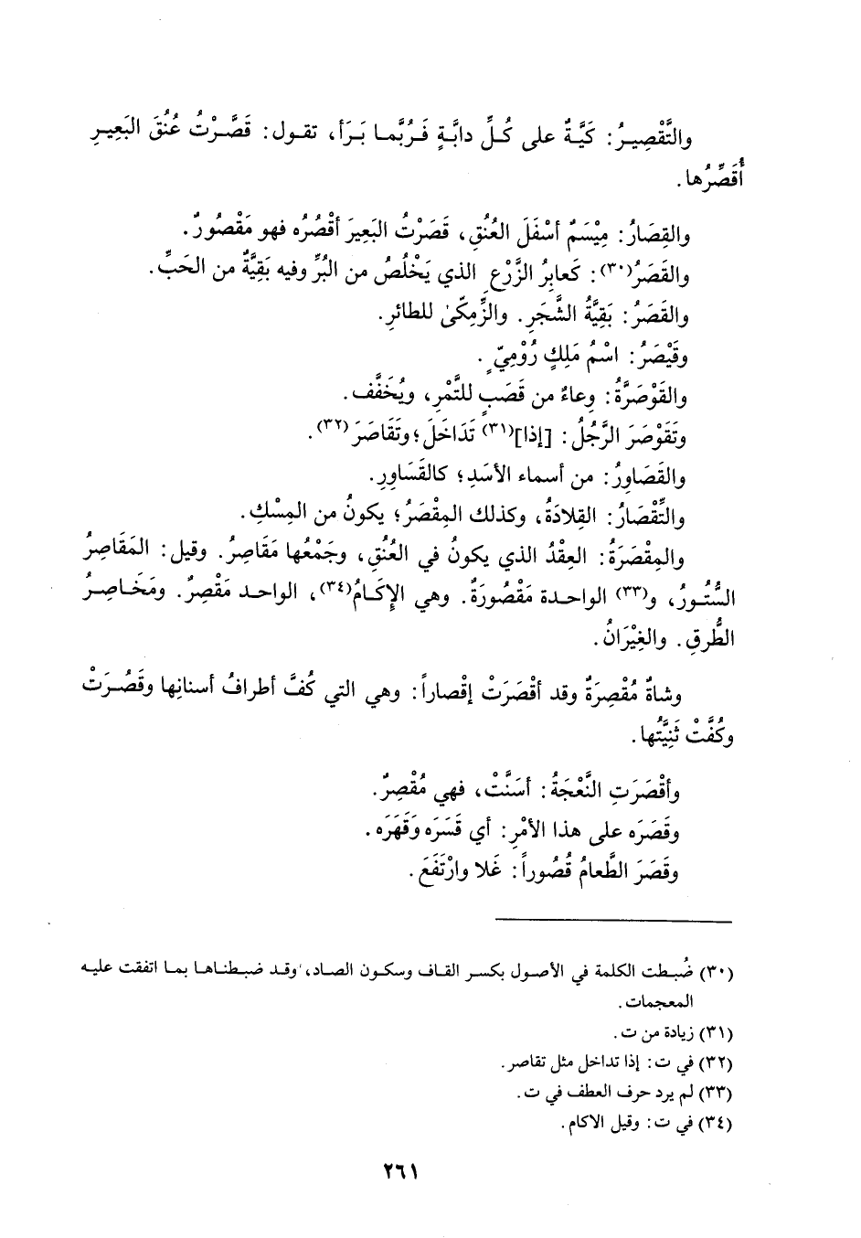 والتَّقْصيرُ : كَيَّةٌ على كُلِّ دابَّةٍ فَرُبَّما بَرَأ ، تقول : قَصَّرْتُ عُنُقَ البَعِيرِ أقَصِّرُها . والقِصَارُ : مِيْسَمٌ أسْفَلَ العُنُقِ ، قَصَرْتُ البَعِيرَ أقْصُرُه فهو مَقْصُور . والقَصَرُ : كَعابِرُ الزَّرْع الذي يَخْلُصُ من البُرِّ وفيه بَقِيَّةٌ من الحَبِّ . والقَصَرُ : بَقِيَّةُ الشَّجَرِ . والزًّمِكّى للطائرِ . وقَيْصَرُ : اسْمُ مَلِكٍ رُوْمِيّ . والقَوْصَرَّةُ : وِعاءٌ من قَصَبِ للتَّمْرِ ، وُيخَفَّف . وتَقَوْصَرَ الرَّجُلُ : إذا تَدَاخَلَ وتَقَاصَرَ . والقَصَاوِرُ : من أسماء الأسَدِ ؛ كالقَسَاوِرِ . والتِّقْصارُ : القلادة ، وكذلك المِقْصَرُ يكونُ من المِسْكِ . والمِقْصَرَةُ : العِقْدُ الذي يكونُ في العُنُقِ ، وجَمْعُها مَقَاصِرُ . وقيل : المَقَاصِرُ السُّتُورُ ، والواحدة مَقْصُورَةٌ . وهي الإِكَامُ ، الواحد مَقْصِرٌ . ومَخَاصِرُ الطُّرقِ . والغِيْرَانُ . وشاةٌ مُقْصِرَةٌ وقد أقْصَرَتْ إقْصاراً : وهي التي كُفَّ أطرافُ أسنانِها وقَصُرَتْ وكُفَّتْ ثَنِيتُها . وأقْصَرَتِ النَعْجَةُ : أسَنَّتْ ، فهي مُقْصِر . وقَصَرَه على هذا الأمْرِ : أي قَسَرَه وَقَهَرَه . وقَصَرَ الطَّعامُ قُصُوراً : غَلا وارْتَفَعَ .