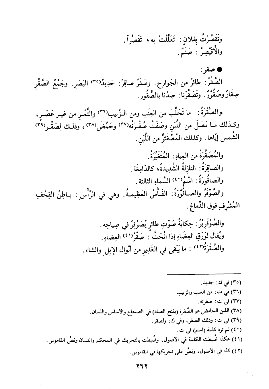 وتَقَصرْتُ بِفلانٍ : تعللت به ؛ تقصراً . الأقَيْصِرُ : صَنَمٌ . صقر الصَّقْرُ : طائرٌ من الجَوارح . وصَقْرٌ صاقِرٌ : حَدِيدُ البَصَرِ . وجَمْعُ الصَّقْرِ صِقَارٌ وصُقُوْرٌ . وتَصَقَّرْنا : صِدْنا بالصُّقُور . والصُقْرَةُ : ما تَحَلَّبَ من العِنَب ومن الزَّبيب والتَمْرِ من غير عَصْرٍ ، وكذلك ما مَصلَ من اللَّبَنِ وصَفَتْ صُفْرَتُه وحَمُضَ ، وذلك لِصَقْر الشَمس إيّاها . وكذلك المُصْقَئرُّ من اللَّبَنِ . والمُصَقَّرَةُ من المِياهِ : المُتَغَيِّرَةُ . والصاقِرَةُ : النازِلةُ الشَّدِيدةُ ؛ كالدّامِغَة . والصاقُورَةُ : اسْمُ السَّماءِ الثالثة . والصَوْقَرُ والصاقُوْرَةُ : الفَأسُ العَظِيمةُ . وهي في الرّأس : باطِنُ القِحْفِ المُشْرِفِ فوق الدِّماغ . والصَّوْقَرِيْرُ : حِكايَةُ صَوْتِ طائرٍ يُصوْقِرُ في صِياحِه . وُيقال لوَرَقِ العِضَاهِ إذا انْحَتَّ : صَقْرُ العِضاهِ . والصَّقْرَةُ : ما يَبْقى في الغَدِيرِ من أبْوال الإِبِل والشاء .