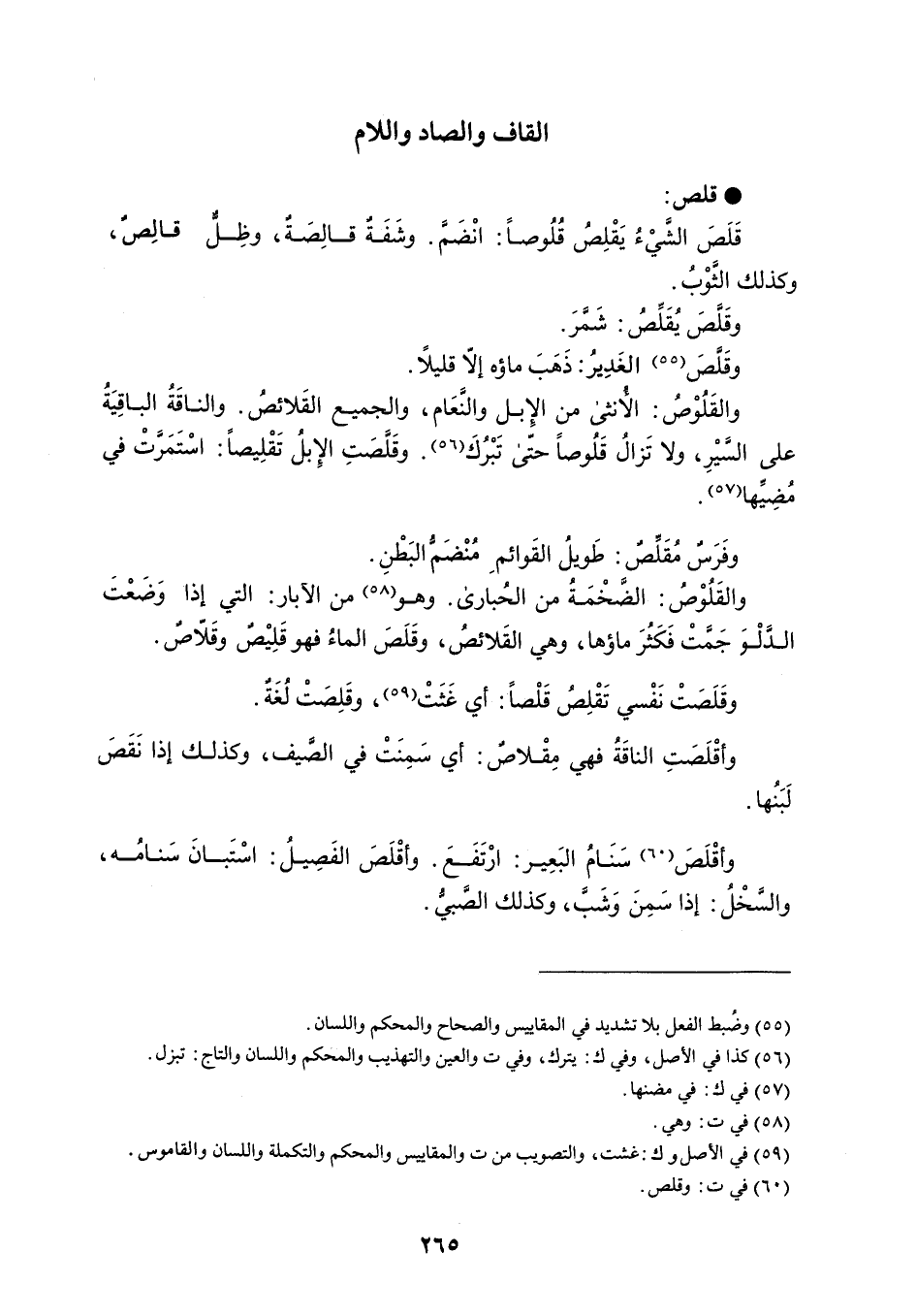 قلص قَلَصَ الشَّيْءُ يَقْلِصُ قُلُوصاً : انْضَمَّ . وشَفَةٌ قالِصةٌ ، وظِلٌّ قالِصٌ ، وكذلك الثَّوْبُ . وقَلَّصَ يُقَلِّصُ : شَمَّرَ . وقَلَّصَ الغَدِيرُ : ذَهَبَ ماؤه إلا قليلاً . والقَلُوْصُ : الأنثى من الإبل والنَّعَام ، والجميع القَلائص . والناقَةُ الباقِيَةُ على السَّيْرِ ، ولا تَزالُ قَلُوصاً حتّى تَبْرُكَ . وقَلَّصَتِ الإبلُ تَقْلِيصاً : اسْتَمًرّتْ في مُضِيِّها . وفَرَسٌ مُقَلِّصٌ : طَويلُ القَوائم مُنْضَمُ البَطْنِ . والقَلُوْصُ : الضخْمَةُ من الحُبارى . وهو من الآبار : التي إذا وَضَعْت الدَّلْوَ جَمَّتْ فَكَثُرَ ماؤها ، وهي القَلائصُ ، وقَلَصَ الماءُ فهو قَلِيْصٌ وقَلاصق . وقَلَصَتْ نَفْسي تَقْلِصُ قَلْصاً : أي غَثَتْ ، وقَلِصَتْ لُغَةٌ . وأقْلَصَتِ الناقَةُ فهي مِقْلاصٌ : أي سَمِنَتْ في الصَيف ، وكذلك إذا نَقَصَ لبنها . وأقْلَصَ سنَامُ البَعِير : ارْتَفَعَ . وأقْلَصَ الفَصِيلُ : اسْتَبانَ سَنامُه ، والسَّخْلُ : إذا سَمِنَ وَشَبَّ ، وكذلك الصَّبيُّ .