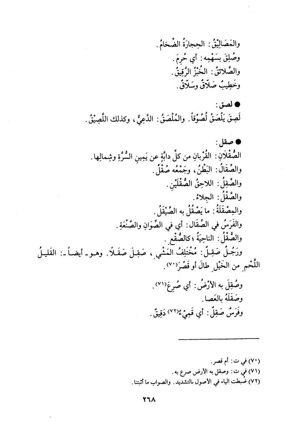 والمَصَالِيْقُ : الحِجارَةً الضِّخامُ . وصُلِقَ بسَهْمِه : أي حُرِمَ . والصَّلائق : الخُبْزُ الرَّقِيقُ . وخَطِيبٌ صَلاقٌ وسَلاقٌ . لصق لَصِقَ يَلْصَقُ لُصُوْقاً . والمُلْصَقُ : الدًعِيُّ ، وكذلك اللَّصِيْقُ . صقل الصُّقْلانِ : القُرْبانِ من كلِّ دابَّةٍ عن يَمِينِ السُّرَةِ وشِمالِها . والصِّقَالُ : البَطْنُ ، وجَمْعُه صُقْلٌ . والصَقِلُ : اللاحِقُ الصقْلَيْنِ . والصقلُ : الجِلاءُ . والمِصْقَلَةُ : ما يَصْقُلُ به الصَّيْقَلُ . والفَرَسُ في الصِّقَال : أي في الصِّوَانِ والصَّنْعَةِ . والصُقْلُ : الناحِيَةُ ؛ كالصُّقْع . ورَجُلٌ صَقِلٌ : مُخْتَلِفُ المَشْي ، صَقِلَ صَقَلاً . وهو - أيضاً - : القليل اللَّحْم من الخَيْل طالَ أو قَصُرَ . وصُقِلَ به الأرْضُ : أي صُرِعَ . وصَقَلَهُ بالعَصا . وفَرَس صَقِلٌ : أي قَمِيْءٌ دَقِيق .