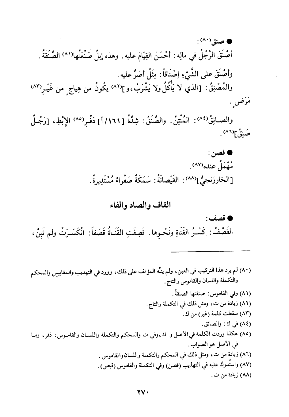 صنق أصْنَقَ الرَّجُلُ في مالِه : أحْسَنَ القِيَامَ عليه . وهذه إبلٌ صَنْعَتُها الصَّنَقَةُ . وأصْنَقَ على الشِّيْءِ إصْنَاقاً : مِثْلُ أصَرَّ عليه . والمُصنِقُ : الذي لا يَأْكُلُ ولا يَشْرَبُ ، و يكُونُ من هِياجٍ من غَيْرِ مَرَض . والصانِقُ : المُنْتِنُ . والصَّنَقُ : شِدَّةُ دَفْرِ الإِبْطِ ، رَجُلٌ صَنِقٌ . قصن مُهْمَلٌ عنده . الخارزنجيُّ : القَيْصانَةُ : سَمَكَةٌ صَفْراءُ مُسْتَدِيرةٌ .