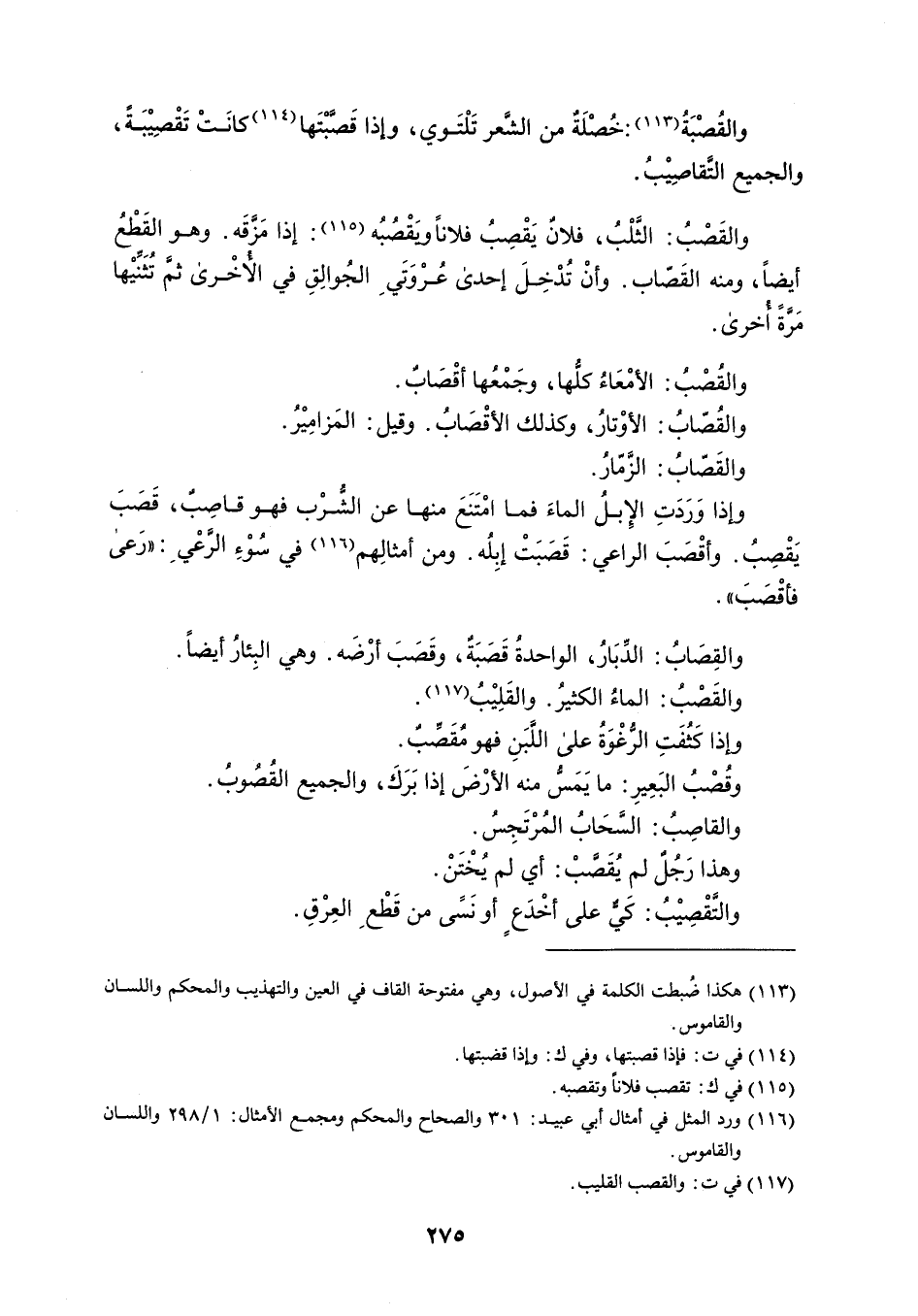 والقُصْبَة : خُصْلَةٌ من الشَعر تَلْتَوي ، وإذا قَصَبْتَها كانَتْ تَقْصِيْبَةً ، والجميع التَقاصِيْبُ . والقَصْبُ : الثَّلْبُ ، فلانٌ يَقْصِبُ فلاناً ويَقْصُبُه : إذا مَزَّقَه . وهو القَطْعُ أيضاً ، ومنه القَصّاب . وأنْ تُدْخِلَ إحدى عُرْوَتَي الجُوالِقِ في الأخْرى ثمَّ تثَنِّيْها مَرَةً أُخرى . والقُصْبُ : الأمْعَاءُ كلُّها ، وجَمْعُها أقْصَابٌ . والقُصّابُ : الأوْتارُ ، وكذلك الأقْصَابُ . وقيل : المَزامِيْرُ . والقَصّابُ : الزَّمّارُ . وإذا وَرَدَتِ الإِبلُ الماءَ فما امْتَنَعَ منها عن الشُّرْب فهو قاصِبٌ ، قَصبَ يَقْصبُ . وأقْصَبَ الراعي : قَصبَتْ إبِلُه . ومن أمثالِهم في سُوْءِ الرَّعْي : ' رَعى فأقْصَبَ ' . والقِصَابُ : الدِّبَارُ ، الواحدةُ قَصبَةٌ ، وقَصَبَ أرْضَه . وهي البِئارُ أيضاً . والقَصْبُ : الماءُ الكثيرُ . والقَلِيْبُ . وإذا كَثفَتِ الرُّغْوَةُ على اللَبَنِ فهو مقَصِّبٌ . وقُصْبُ البَعِيرِ : ما يَمَسُّ منه الأرْضَ إذا بَرَكَ ، والجميع القُصُوبُ . والقاصِبُ : السَّحَابُ المُرْتَجِسُ . وهذا رَجُلٌ لم يُقَصَّبْ : أي لم يُخْتَنْ . والتَّقْصِيْبُ : كَيٌّ على أخْدَعٍ أو نَسًى من قَطْع العِرْقِ .