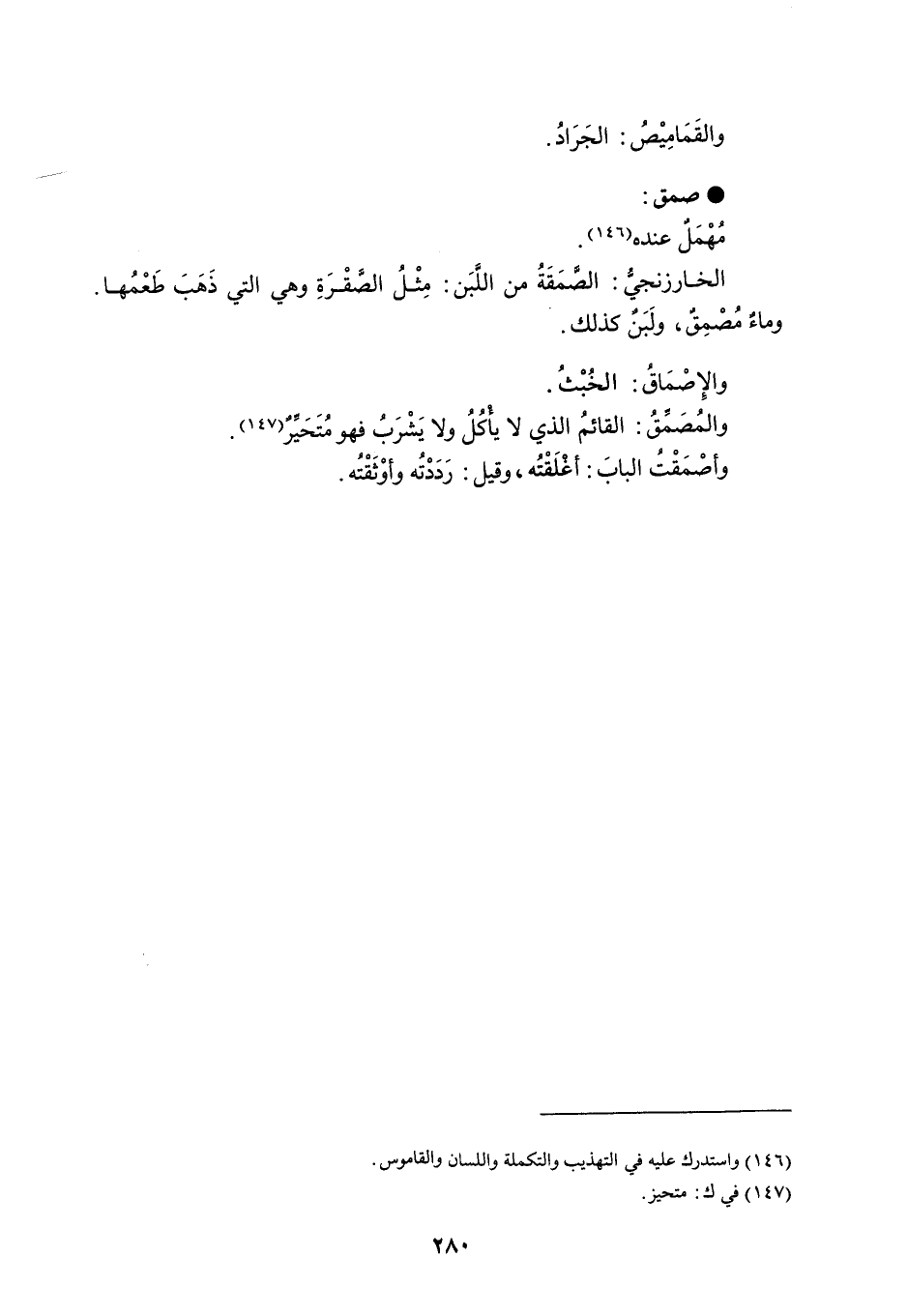 والقَمَامِيْصُ : الجَرَادُ . صمق مُهْمَلٌ عنده . الخارزنجيُّ : الصَّمَقَةُ من اللَّبَن : مِثْلُ الصَّقْرَةِ وهي التي ذَهَبَ طَعْمُها . وماءٌ مُصْمِقٌ ، ولَبَنٌ كذلك . والإصْمَاقُ : الخُبْثُ . والمُصَمِّقُ : القائمُ الذي لا يأْكُلُ ولا يَشْرَبُ فهو مُتَحَيِّرٌ . وأصْمَقْتُ البابَ : أغلَقْتُه ، وقيل : رددْتُه وأوْثَقْتُه .