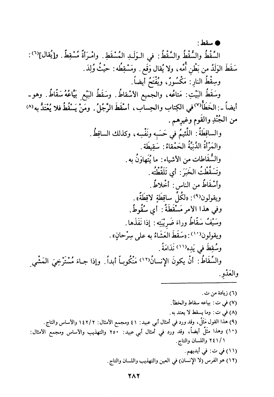 سقط السِّقْطُ والسُّقْطُ والسَّقْطُ : في الوَلَدِ المُسْقَطِ . وامْرَأةٌ مُسْقِطٌ . ويُقال : سَقَطَ الوَلَدُ من بَطْنِ أمِّه ، ولا يُقال وَقَع . ومَسْقِطُه : حيْثُ وُلدَ . وسِقْطُ النارِ : مَكْسُور ، ويُفْتَحُ أيضاً . وسَقَطُ البَيْتِ : مَتاعُه ، والجميع الأسْقاطُ . وسَقَطُ البَيْع بَياعُهُ سَقّاطٌ . وهو - أيضاً - : الخَطَأ في الكِتاب والحِساب ، أسْقَطَ الرَّجُلُ . ومَنْ يَسْقطُ فلا يُعْتَدُّ به من الجُنْدِ والقَوم وغيرِهم . والساقِطَةُ : اللَئيمُ في حَسَبِه ونَفْسِه ، وكذلك الساقِطُ . والمَرْأةُ الدِّنِيَّةُ الحَمْقاءُ : سَقِيطَة . والسُّقَاطات من الأشياء : ما يُتَهاوَنُ به . وتَسَقَّطْتُ الخَبَرَ : أي تَلَقَّطْتُه . وأسْقَاطٌ من الناس : أخْلاطٌ . ويقولون : ' لكُلَ ساقِطَةٍ لاقِطَةٌ ' . وفي هذا الأمر مسقطة : أي سُقُوطٌ . وسَيْفٌ سَقّاطٌ وراءَ ضَرِيْبَتِه : إذا نَفَذَها . ويقولون : ' سَقَطَ العَشَاءُ به على سِرْحانٍ ' . وسُقِطَ في يَدِه نَدَامَةً . والسِّقَاطُ : أنْ يكونَ الإنسانُ مَنْكُوباً أبداً . وإذا جاءَ مُسْتَرْخِيَ المَشْي والعَدْوِ .