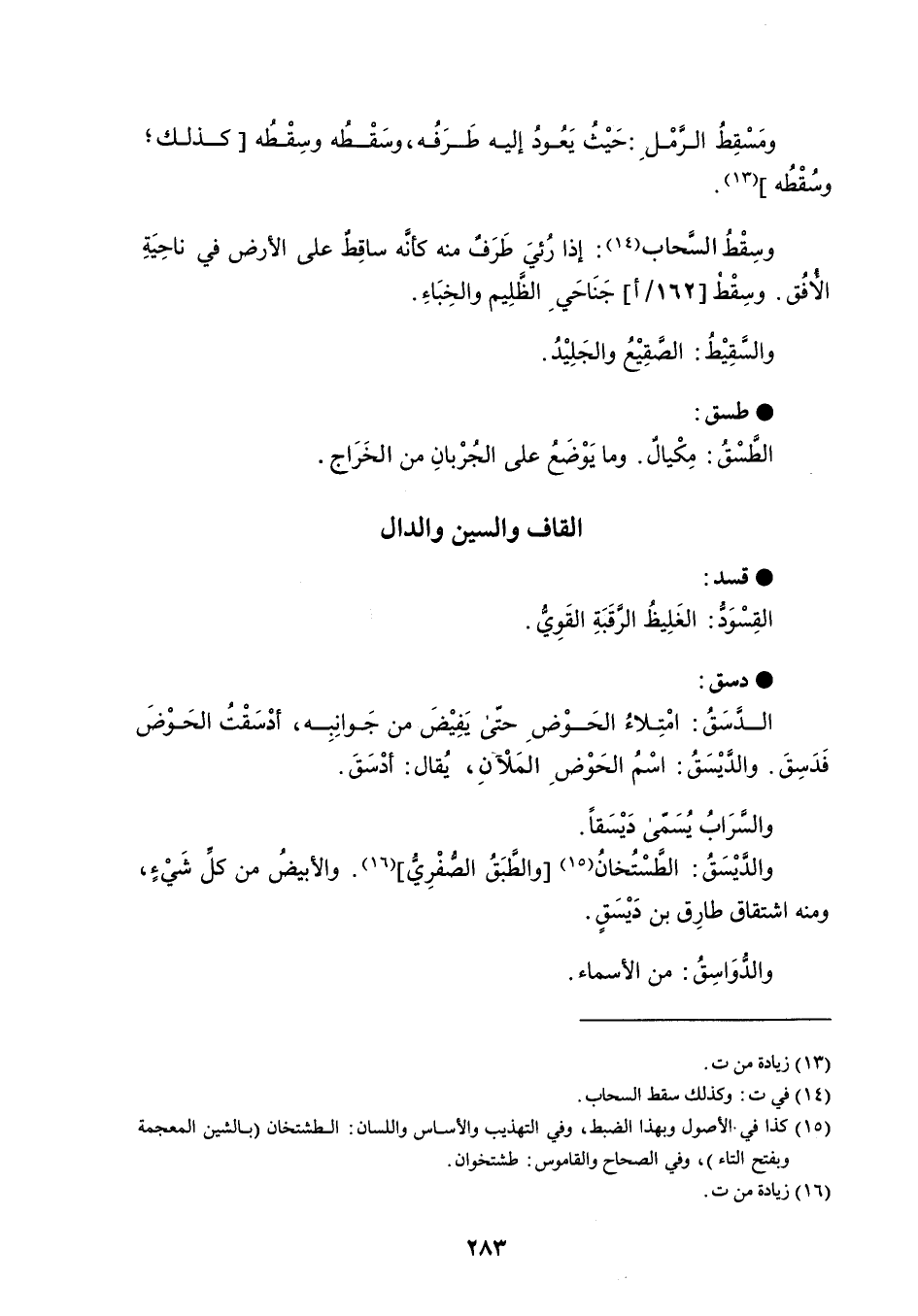 قسد القِسْوَدُّ : الغَلِيظُ الرَّقَبَةِ القَوِيُّ . دسق الدَّسَقُ : امْتِلاءُ الحَوْض حتّى يَفِيْضَ من جَوانِبِه ، أدْسَقْتُ الحَوْضَ فَدَسِقَ . والدَّيْسَقُ : اسْمُ الحَوْض المَلآنِ ، يُقال : أدْسَقَ . والسَّرَابُ يُسَمّى دَيْسَقاً . والدَّيْسَقُ : الطَّسْتُخانُ والطَّبَق الصُفْرِيُّ . والأبيضُ من كل شَيْءٍ ، ومنه اشتقاق طارِق بن دَيْسَقٍ . والدُّوَاسِقُ : من الأسماء .