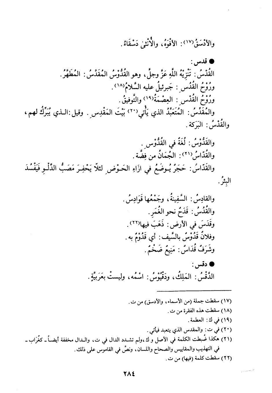 والأدْسَقُ : الأفْوهُ ، والأنْثى دَسْقَاءُ . قدس القُدْسُ : تَنْزِيْهُ اللَّهِ عًزّ وجلَّ ، وهو القُدُّوْسُ المُقَدَّسُ : المُطَهَّرُ . ورُوْحُ القُدُس : جَبرئيلُ عليه السَّلامُ . ورُوْحُ القُدْس : العِصْمَةُ والتَّوفيقُ . والمُقَدِّسُ : المُتَعَبِّدُ الذي يَأتي بَيْتَ المَقْدِس . وقيل : الذي يُبَرِّكُ لهم ، والقُدْسُ : البَرَكة . والقَدُّوْسُ : لُغَةٌ في القُدُّوْس . والقُدّاسُ : الجُمَانُ من فِضَّة . والقَدّاس : حَجَرٌ يُوضَعُ في ازَاءِ الحَوْض لئلا يَحْفِرَ مَصبُّ الدَّلْوِ فَيَفْسُدَ البئر . والقادِسُ : السَّفِينةُ ، وجَمْعُها قَوَادِسُ . والقُدُسُ : قَدَحٌ نحو الغُمَرِ . وقَدَسَ في الأرض : ذَهَبَ فيها . وفلانٌ قَدُوْسٌ بالسَّيف : أي قَدُوْمٌ به . وشَرَفٌ قُدَاسٌ : مَنِيعٌ ضَخْمٌ . دقس الدَّقْسُ : المَلِكُ ، ودَقْيُوْسُ : اسْمُه ، وليستْ بعَرَبيَّةٍ .