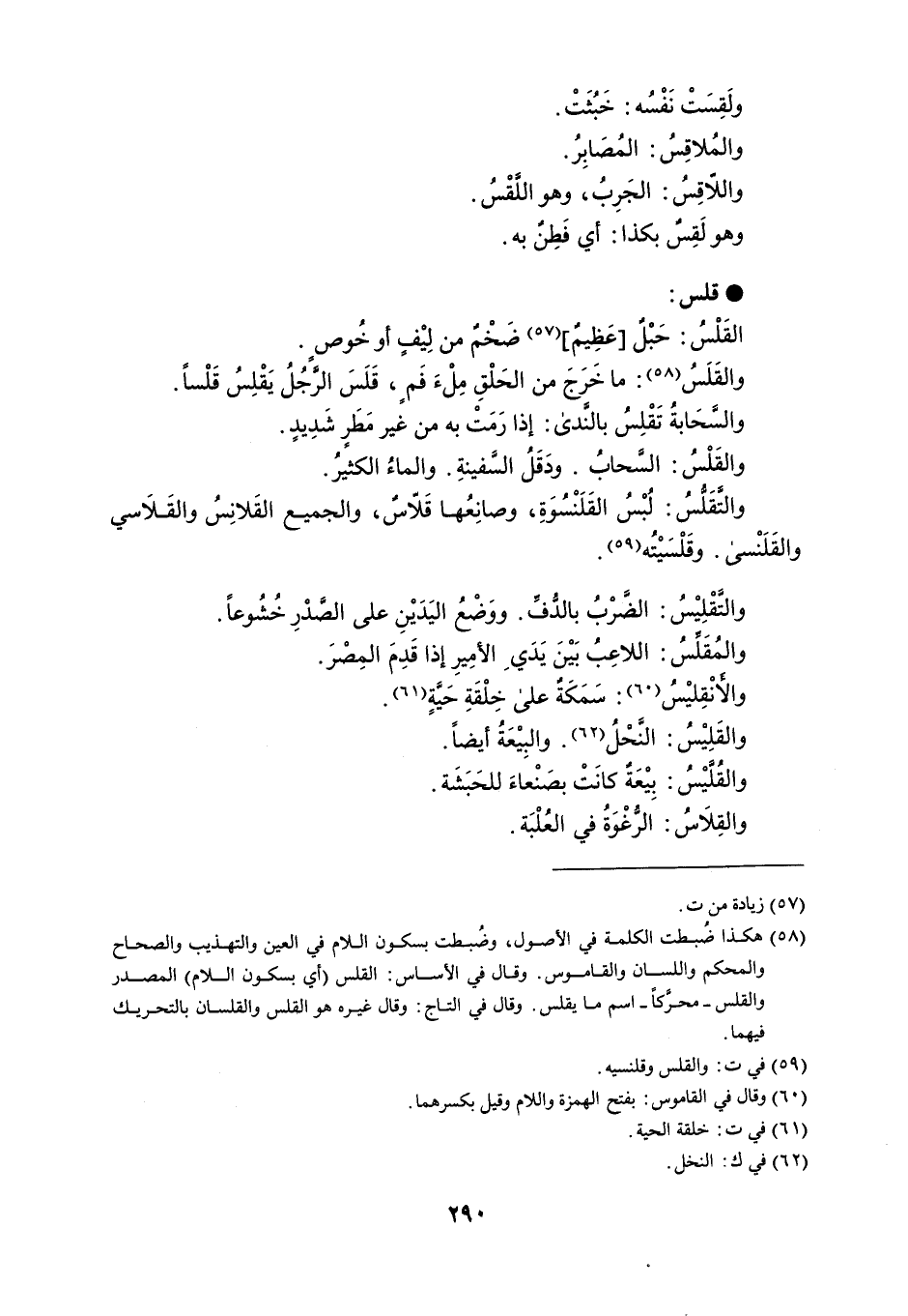 ولَقسَتْ نَفْسُه : خَبُثَتْ . والمُلاقِسُ : المُصَابِرُ . واللاّقِسُ : الجَرِبُ ، وهو اللَّقْسُ . وهو لَقِسٌ بكذا : أي فَطِنٌ به . قلس القَلْسُ : حَبْلٌ عَظِيمٌ ضَخْمٌ من لِيْفٍ أو خُوصٍ . والقَلَسُ : ما خَرَجَ من الحَلْقِ مِلْءَ فَمٍ ، قَلَسَ الرَّجُلُ يَقْلِسُ قَلْساً . والسَّحَابةُ تَقْلِسُ بالنَّدى : إذا رَمَتْ به من غير مَطَرٍ شَدِيدٍ . والقَلْسُ : السَّحابُ . ودَقَلُ السَّفينةِ . والماءُ الكثيرُ . والتَّقَلُّسُ : لُبْسُ القَلَنْسُوَةِ ، وصانِعُها قَلاسٌ ، والجميع القَلانِسُ والقَلاسي والقَلَنْسى . وقَلْسَيْتُه . والتقْلِيْسُ : الضَّرْبُ بالدُّفِّ . ووَضْعُ اليَدَيْنِ على الصَّدْرِ خُشُوعاً . والمُقَلِّسُ : اللاعِبُ بَيْنَ يَدَي الأمِيرِ إذا قَدِمَ المِصْرَ . والأنْقِليْسُ : سَمَكَةٌ على خِلْقَةِ حَيَّةٍ . والقَلِيْسُ : النَّحْلُ . والبِيْعَةُ أيضاً . والقُلَّيْسُ : بِيْعَةٌ كانتْ بصنْعاءَ للحَبَشَة . والقِلاَسُ : الرُّغْوَةُ في العُلْبَة .