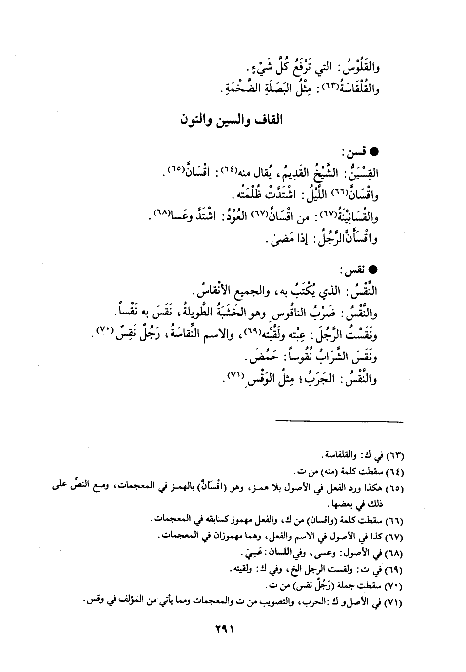 قسن القِسْيَنُّ : الشَّيْخُ القَدِيمُ ، يُقال منه : اقْسَانَّ . واقْسَانَّ اللَّيْلُ : اشْتَدَّتْ ظُلْمَتُه . والقُسَانِيْنَةُ : من اقْسَانَّ العُوْدُ : اشْتَدَّ وعَسا . واقْسَأنَّ الرَّجُلُ : إذا مَضى . نقس النِّقْسُ : الذي يُكْتَبُ به ، والجميع الأنْقاسُ . والنِّقْسُ : ضَرْبُ الناقُوس وهو الخَشَبَةُ الطويلة ، نَقَسَ به نَقْساً . ونَقَسْتُ الرَّجُلَ - عِبْته ولَقَّبته ، والاسم النِّقاسَةُ ، رَجُلٌ نَقِسٌ . ونَقَسَ الشَّرَابُ نُقُوساً : حَمُضَ . والنَّقْسُ : الجَرَبُ ؛ مِثلُ الوَقْس .