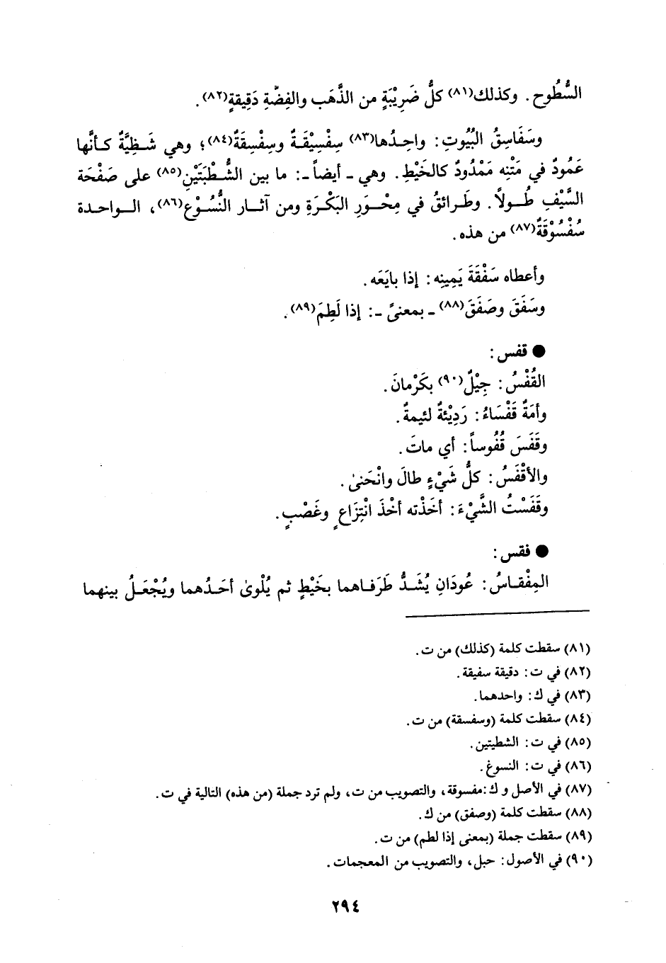 السّطُوح . وكذلك كلُّ ضَرِيْبَةٍ من الذَّهَب والفِضّةِ دَقِيقةٍ . وسَفَاسِقُ البُيُوتِ : واحِدُها سِفْسِيْقَةٌ وسِفْسِقَةٌ وهي شَظِيَّةٌ كأنَّها عَمُودٌ في مَتْنِه مَمْدُودٌ كالخَيْطِ . وهي - أيضاً - : ما بين الشُّطْبَتَيْنِ على صَفْحَة السَّيْفِ طولاً . وطَرائقُ في مِحْوَرِ البَكْرَةِ ومن آثار النُّسُوْع ، الواحدة سُفْسُوْقَةٌ من هذه . وأعطاه سَفْقَةَ يَمِينِه : إذا بايَعَه . وسَفَقَ وصَفَقَ - بمعنىً - : إذ لطِمَ . قفس القُفْسُ : جِيْلٌ بكَرْمانَ . وأمَةٌ قَفْسَاءُ : رَدِيئةٌ لئيمةٌ . وقَفَسَ قُفُوساً : أي ماتَ . والأقْفَسُ : كلُّ شَيْءٍ طالَ وانْحَنى . وقَفَسْتُ الشَّيْءَ : أخَذْته أخْذَ انْتِزَاعٍ وغَصْبٍ . فقس المِفْقاسُ : عُودَانِ يُشَدُّ طَرَفاهما بخَيْطٍ ثم يُلْوى أحَدُهما ويُجْعَلُ بينهما