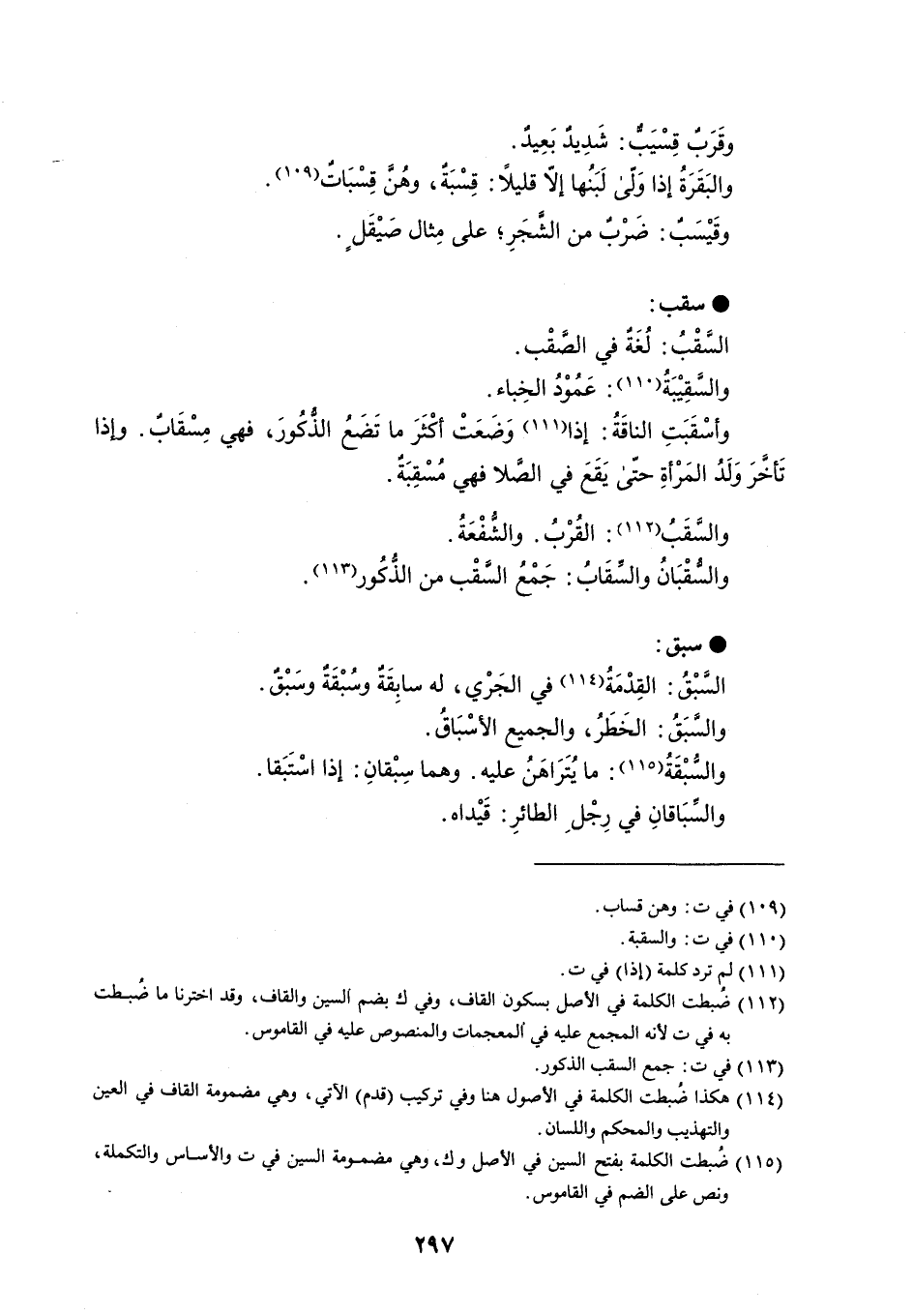وقَرَبٌ قِسْيَبٌّ : شَدِيدٌ بَعِيدٌ . والبَقَرَةُ إذا وَلّى لَبَنُها إلا قليلاً قِسْبَةٌ ، وهُنَ قِسْبَات . وقَيْسَب : ضَرْبٌ من الشَجَرِة على مِثال صَيْقَل . سقب السقْبُ : لُغَة في الصَّقْب . والسقِيْبَةُ : عَمُوْدُ الخِباء . وأسْقَبَتِ الناقَةُ : إذا وَضَعَتْ أكْثَرَ ما تَضَعُ الذُكُورَ ، فهي مِسْقَابٌ . وإذا تَأخرَ وَلَدُ المَرْأةِ حتّى يَقَعَ في الصَلا فهي مُسْقِبَةٌ . والسَّقَب : القُرْبُ . والشفْعَةُ . والسُّقْبَانُ والسِّقَابُ : جَمْعُ السقْب من الذكُور . سبق السبْقُ : القِدْمَةُ في الجَرْي ، له سابِقَةٌ وسبْقَةٌ وسَبْقٌ . والسبَقُ : الخَطَرُ ، والجميع الأسْبَاقُ . والسبْقَةُ : ما يُتَرَاهَنُ عليه . وهما سِبْقانِ : إذا اسْتَبَقا . والسبَاقانِ في رِجْل الطائرِ : قَيْداه .