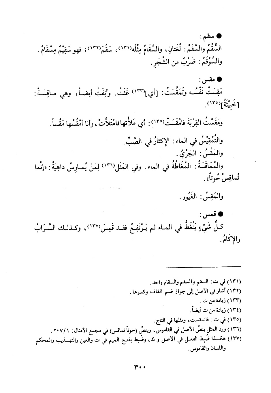 سقم السُّقْمُ والسَّقَمُ : لُغَتانِ ، والسَّقَامُ مِثْلُه ، سَقُمَ ؛ فهو سَقِيْمٌ مِسْقَامٌ . والسَّوْقَمُ : ضَرْبٌ من الشَجَرِ . مقس مَقِسَتْ نَفْسُه وتَمَقَّسَتْ : أي غَثَتْ . وأنِفَتْ أيضاً ، وهي ماقِسَةٌ : خَبِيْثَةٌ . ومَقَسْتُ القِرْبَةَ فامَّقَسَتْ : أي مَلأتها فامتَلأتْ ، وأنا أمْقُسُها مَقْساً . والتَمْقِيْسُ في الماء : الإكثارُ في الصَّب . والمَقْسُ : الجَرْيُ . والمُمَاقَسَةُ : المُغَاطَةُ في الماء . وفي المَثَل لِمَنْ يُمارِسُ داهِيَةً : ' إنَما تُماقِسُ حُوتاً ' . والمَقِسُ : الغَيُور . قمس كل شَيْءٍ يَنْغَط في الماء ثم يَرْتَفِعُ فقد قَمِسَ ، وكذلك السَّرَابُ والإكَامُ .