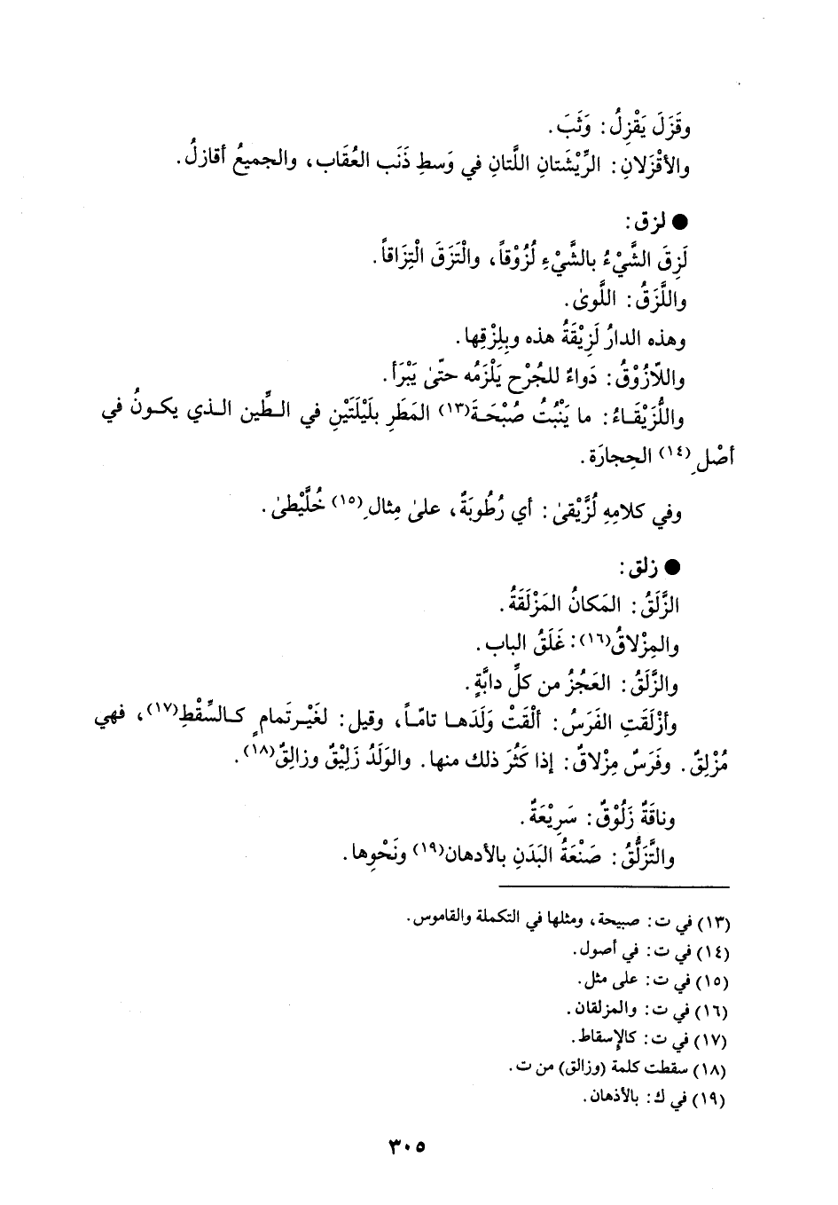 وقَزَلَ يَقْزِل : وَثَبَ . والأقْزَلانِ : الريْشَتانِ اللِّتانِ في وَسطِ ذَنَب العُقَاب ، والجميعُ أقازلُ . لزق لَزِقَ الشَيْءُ بالشيْءِ لُزُوْقَاَ ، والْتَزَقَ الْتِزَاقاً . واللًزَقُ : اللَّوى . وهذه الدارُ لَزِيْقَةُ هذه وبِلِزْقِها . واللازُوْقُ : دَواءٌ للجُرْح يَلْزَمُه حتّى يَبْرَأ . واللزَيْقَاءُ : ما يَنْبُتُ صُبْحَةَ المَطَرِ بلَيْلَتَيْنِ في الطين الذي يكونُ في أصْل الحِجارَة . وفي كلامِهِ لُزيْقى : أي رُطُوبَةٌ ، على مِثال خُليْطى . زلق الزلَقُ : المَكانُ المَزْلَقَةُ . والمِزْلاقُ : غَلَقُ الباب . والزلَقُ : العَجُزُ من كل دابَّةٍ . وأزْلقَّتِ الفَرَسُ : ألْقَتْ وَلَدَها تاماً ، وقيل : لغَيْر تَمام كالسقْطِ ، فهي مُزْلِقٌ . وفَرَسٌ مِزْلاقٌ : إذا كَثُرَ ذلك منها . والوَلَدُ زَلِيْقٌ وزالِقٌ . وناقَةٌ زَلُوْقٌ : سَرِيْعَةٌ . والتَزلقُ : صَنْعَةُ البَدَنِ بالأدهان ونَحْوِها .