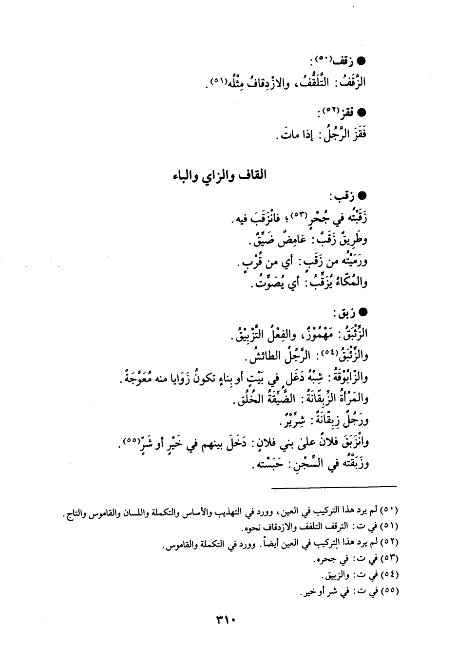 زقف الزَّقَفُ : التَّلَقًّفُ ، والازْدِقافُ مِثْلُه . فقز فَقَزَ الرَّجُلُ : إذا ماتَ .