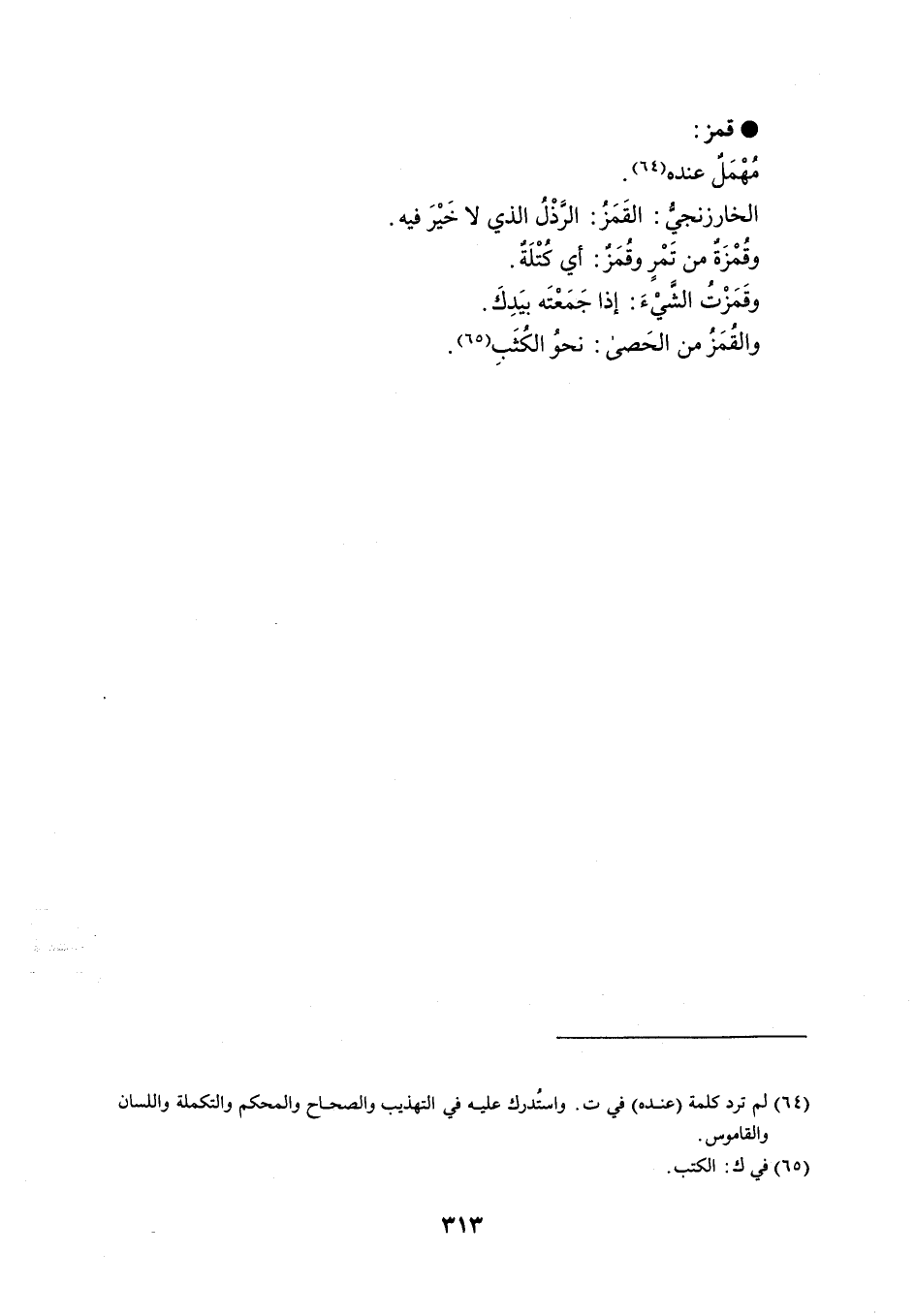 قمز مهْمَلٌ عنده . الخارزنجيُ : القَمَزُ : الرَّذْلُ الذي لا خَيْرَ فيه . وقُمْزَةٌ من تَمْر وقُمَزٌ : أي كُتْلَةٌ . وقَمَزْتُ الشَّيْءَ : إذا جَمَعْتَه بيَدِكَ . والقُمَزُ من الحَصى : نحوُ الكُثَبِ .