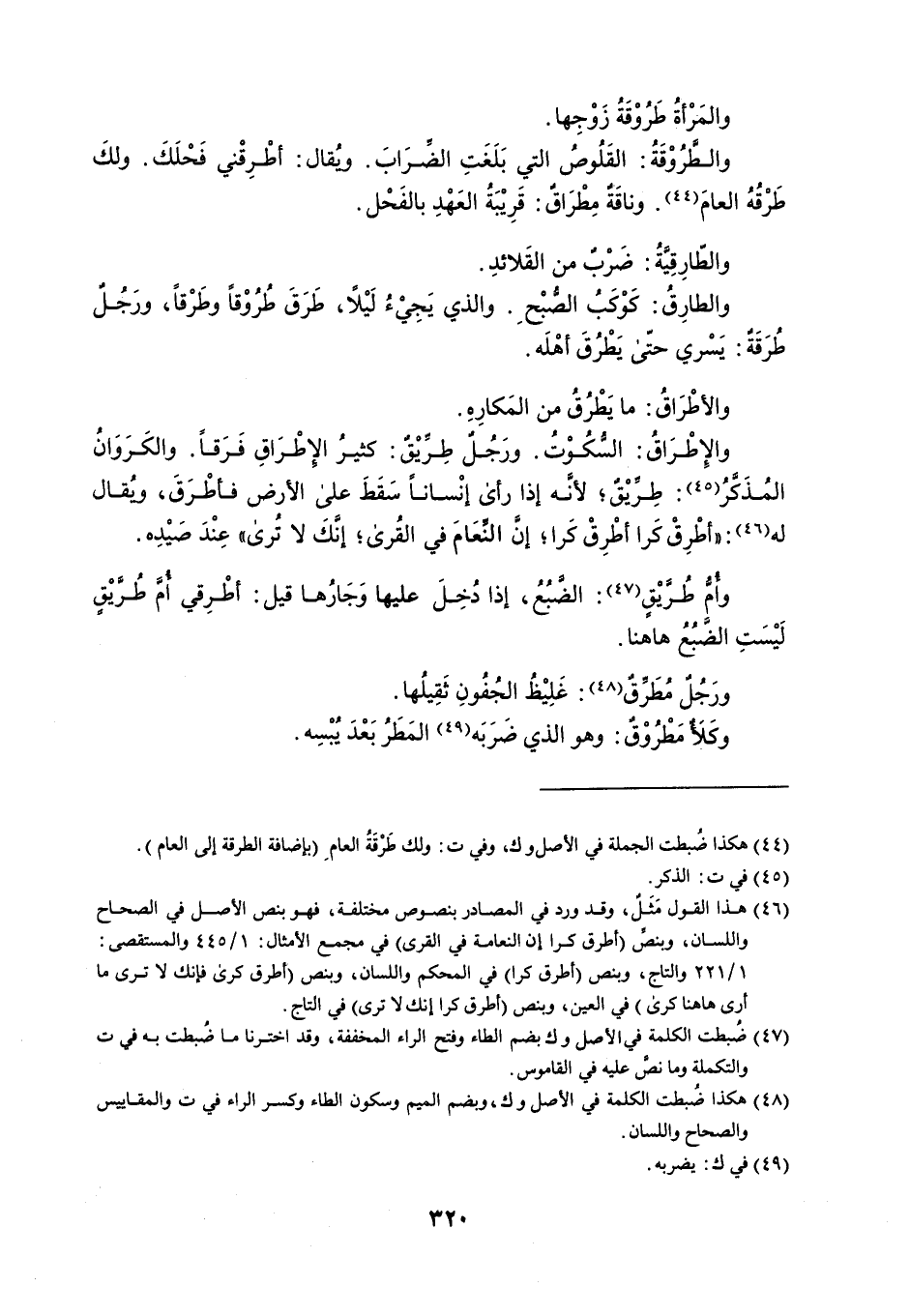 والمَرْأةُ طَرُوْقَةُ زَوْجِها . والطَّرُوْقَةُ : القَلُوصُ التي بَلَغَتِ الضرَابَ . ويُقال : أطْرِقْني فَحْلَكَ . ولكَ طَرْقُهُ العامَ . وناقَةٌ مِطْرَاقٌ : قَرِيْبَةُ العَهْدِ بالفَحْل . والطّارِقِيَّةُ : ضَرْبٌ من القَلائدِ . والطارِق : كَوْكَبُ الصُّبْح . والذي يَجِيْء لَيْلاً ، طَرَقَ طُرُوْقاً وطَرْقاً ، ورَجُلٌ طُرَقَةٌ : يَسْري حتّى يَطْرُقَ أهْلَه . والأطْرَاقُ : ما يَطْرُقُ من المَكارهِ . والإطْرَاقُ : السُّكُوْتُ . ورَجُلٌ طِرِّيْقٌ : كثيرُ الإطْرَاقِ فَرَقاً . والكَرَوَان المُذَكِّرْ : طِرِّيْقٌ لأنَّه إذا رأى إنْساناً سَقَطَ على الأرض فأطْرَقَ ، ويُقال له : ' أطْرِقْ كَرا أطْرِقْ كَرا ؛ إن النعَامَ في القُرى ، إنَّكَ لا تُرى ' عِنْدَ صَيدِه . وأمُّ طُرّيْقٍ : الضَّبُعُ ، إذا دُخِلَ عليها وَجَارُها قيل : أطْرِقي أمَّ طُريق لَيْسَتِ الضَبُعُ ها هنا . ورَجُلٌ مُطَرقٌ : غَلِيْظُ الجُفُونِ ثَقِيلُها . وكَلأ مَطْرُوْقٌ : وهو الذي ضَرَبَه المَطَرُ بَعْدَ يُبْسِه .