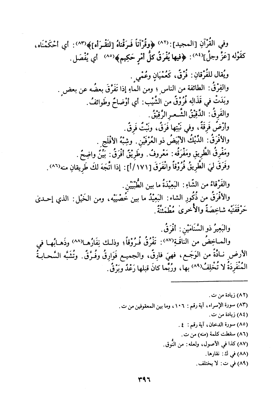 وفي القُرْآنِ المجيد : ' وقُرْآناً فَرَقْناهُ لتَقْرَأه ' أي أحْكَمْنَاه ، كقَوْله عَزَّ وجلَّ : ' فيها يُفْرَقُ كلُّ أمْرٍ حَكِيم ' أي يُفْصَل . ويُقال للفُرْقانِ : فُرْق ، كَعُمْيَانٍ وعُمْيٍ . والفِرْقُ : الطائفة من الناس ؛ ومن الماءِ إذا تَفَرِّقَ بعضُه عن بعضٍ . وبَدَتْ في قَذَالِه فُرُوْقٌ من الشَّيْب : أي أوْضاح وطَوائفُ . والفَرِقُ : الدَقِيْقُ الشَّعرِ الرَّقِيْقُ . وأرْضٌ فَرِقَةٌ ، وفي نَبْتِها فَرَقٌ ، ونَبْتٌ فَرِقٌ . والأفْرَقُ : الدِّيْكُ الأبْيَضُ ذو العُرْفَيْنِ . وشِبْهُ الأفْلَج . ومَفْرِقُ الطَّرِيقِ ومَفْرَقُه : مَعْروفٌ . وطَرِيْقٌ أفْرَقُ : بَيِّنٌ واضِحٌ . وفَرَقَ ليَ الطَرِيقُ فُرُوْقاً وانْفَرَقَ : إذا اتَّجَهَ لكَ طَرِيقانِ منه . والفَرْقاءُ من الشّاءِ : البَعِيْدَةُ ما بين الطُّبْيَيْنِ . والأفْرَقُ من ذُكُورِ الشاء : البَعِيْدُ ما بين خُصيَيْه ، ومن الخَيْل : الذي إحدى حَرْقَفَتَيْه شاخِصَة والأخرى مُطْمَئنَةٌ . والبَعِيرُ ذو السنَامَيْنِ : أفْرَقُ . والماخِض من الناقَةِ : تَفْرُقُ فُرُوْقاً ، وذلك نِفَارُها وذَهابُها في الأرضِ نادَّةً من الوَجَع ، فهيَ فارِقٌ ، والجميع فَوَارِقُ وفُرَّقٌ . وتُشَبَّه السَّحابةُ المُنْفَرِدَةُ لا تُخْلِفُ بها ، ورُبما كانَ قبلها رَعْدٌ وبَرْق .
