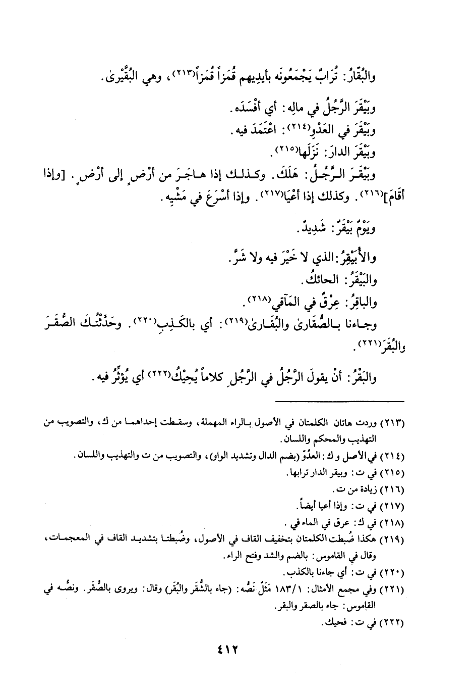 والبُقّارُ : تُرَابٌ يَجْمَعُونَه بأيدِيهم قُّمَزاً قُمَزاً ، وهي البُقَّيْرى . وبَيْقَرَ الرَّجُلُ في مالِه : أي أفْسَدَه . وبَيْقَرَ في العَدْوِ : اعْتَمَدَ فيه . وبَيْقَرَ الدارَ : نَزَلَها . وبَيْقَرَ الرَّجًلُ : هَلَكَ . وكذلك إذا هاجَرَ من أرْضٍ إلى أرْضٍ . وإذا أقَامَ . وكذلك إذا أعْيَا . وإذا أسْرَعَ في مَشْيِه . ويَوْمٌ بَيْقَر : شَدِيدٌ . والأبَيْقِرُ : الذي لا خَيْرَ فيه ولا شَر . والبَيْقَرُ : الحائكُ . والباقِرُ : عِرْقٌ في المَآقي . وجاءنا بالصُّقَارى والبُقَارى : أي بالكَذِب . وحًدّثْتُكَ الصُّقَرَ والبَقْرُ . والبُقَرَ : أنْ يقولَ الرَّجلُ في الرُّجُل كلاماً يُحِيْكُ أي يُؤثِّر فيه .