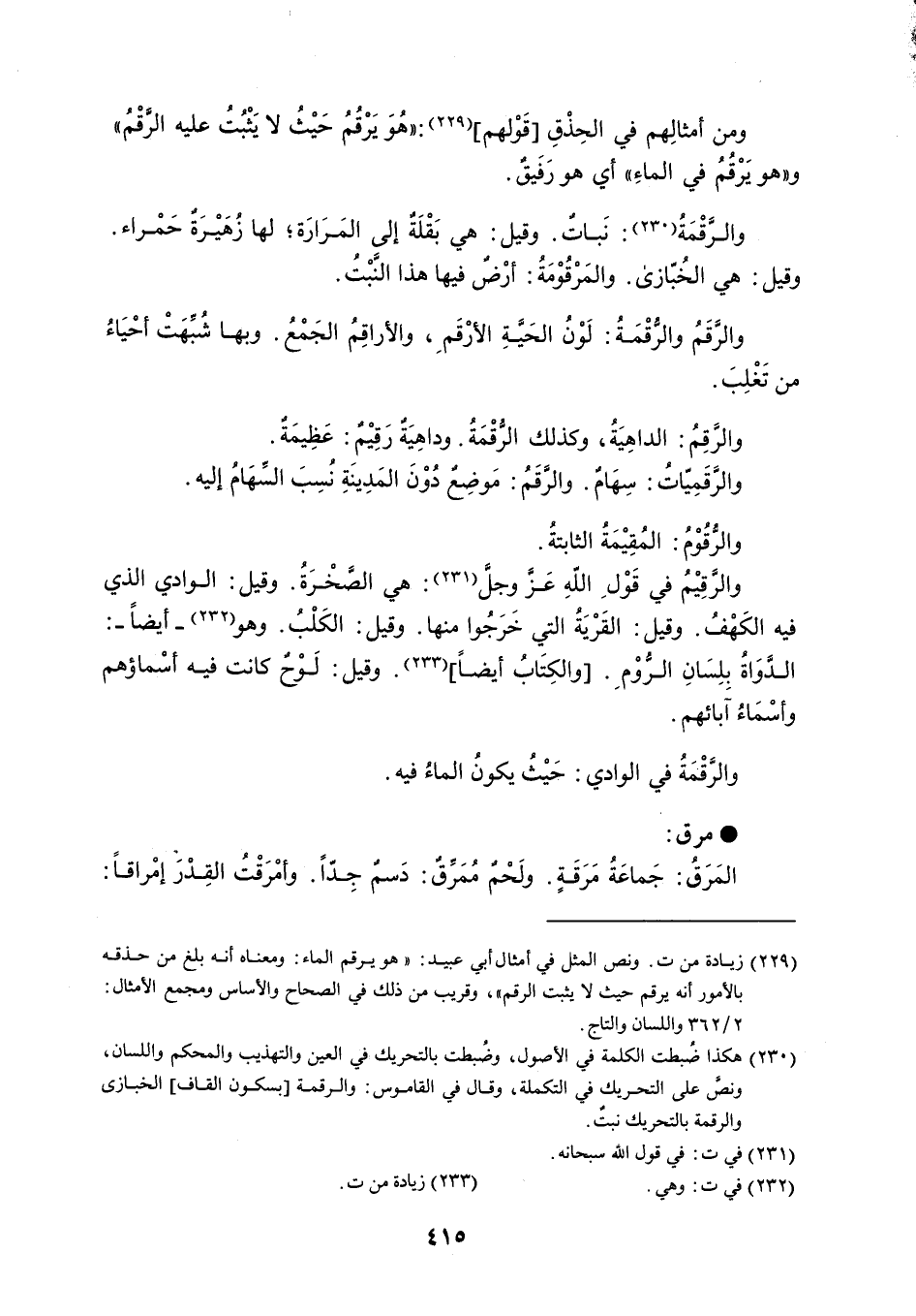 ومن أمثالِهم في الحِذْقِ قَوْلهم : ' هُوَ يَرْقمُ حَيْثُ لا يَثْبُتُ عليه الرَّقْمُ ' و ' هو يَرْقُمُ في الماءِ ' أي هو رَفَيقٌ . والرَّقْمَةُ : نَباتٌ . وقيل : هي بَقْلَةٌ إلى المَرَارَة ؛ لها زُهَيْرَةٌ حَمْراء . وقيل : هي الخُبّازى . والمَرْقُوْمَةُ : أرْضٌ فيها هذا النَّبتُ . والرَّقَمُ والرُّقْمَةُ : لَوْنُ الحَيَّةِ الأرْقَم ، والأراقِمُ الجَمْعُ . وبها شُبِّهَتْ أحْيَاءُ من تَغْلِبَ . والرَّقِمُ : الداهِيَةُ ، وكذلك الرُّقْمَةُ . وداهِيَةٌ رَقِيْمٌ : عَظِيمَةٌ . والرَّقَمِيّاتُ : سِهَامٌ . والرَّقَمُ : مَوضِعٌ دُوْنَ المَدِينَةِ نُسِبَ السِّهَامُ إليه . والرُّقُوْمُ : المقِيْمَةُ الثابتةُ . والرَّقِيْمُ في قَوْل الله عَزَّ وجلَّ : هي الصَّخْرَةُ . وقيل : الوادي الذي فيه الكَهْفُ . وقيل : القَرْيَةُ التي خَرَجُوا منها . وقيل : الكَلْبُ . وهو - أيضاً - : الدَّوَاةُ بِلِسَانِ الرُّوْم . والكِتَاب أيضاً . وقيل : لَوْح كانت فيه أسْماؤهم وأسْمَاءُ آبائهم . والرِّقْمَةُ في الوادي : حَيْثُ يكونُ الماءُ فيه . مرق المَرَق : جَماعَةُ مَرَقَةٍ . ولَحْمٌ مُمَرِّقٌ : دَسمٌ جِدّاً . وأمْرَقْتُ القِدْرَ إمْراقاً :