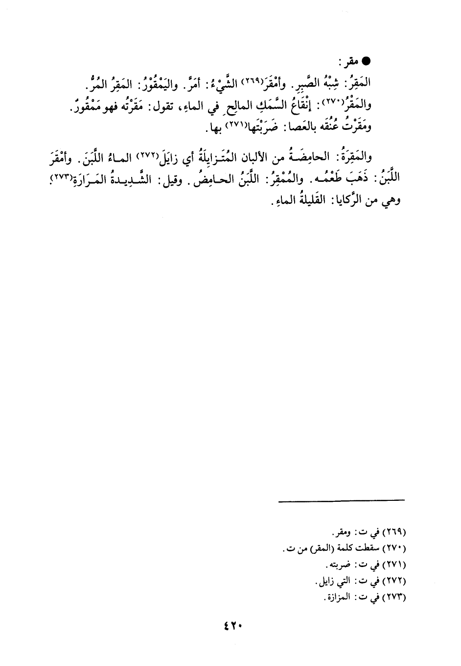 مقر المَقِرُ : شِبْهُ الصَّبِرِ . وأمْقَرَ الشَّيْءً : أمَرَّ . واليَمْقُوْرُ : المَقِرُ المُرُّ . والمَقْرُ : إنْقَاعُ السَّمَكِ المالِح في الماءِ ، تقول : مَقَرْتُه فهو مَمْقُورٌ . ومَقَرْتُ عُنُقَه بالعَصا : ضَرَبْتَها بها . والمَقِرَةُ : الحامِضَةُ من الألبان المُتَزايِلَةُ أي زايَلَ الماءُ اللَّبَنَ . وأمْقَرَ اللَّبَنً : ذَهَبَ طَعْمُه . والمُمْقِرُ : اللَّبَنُ الحامِضُ . وقيل : الشَّدِيدةُ المَرَارَةِ وهي من الرَّكايا : القَليلةُ الماءِ .