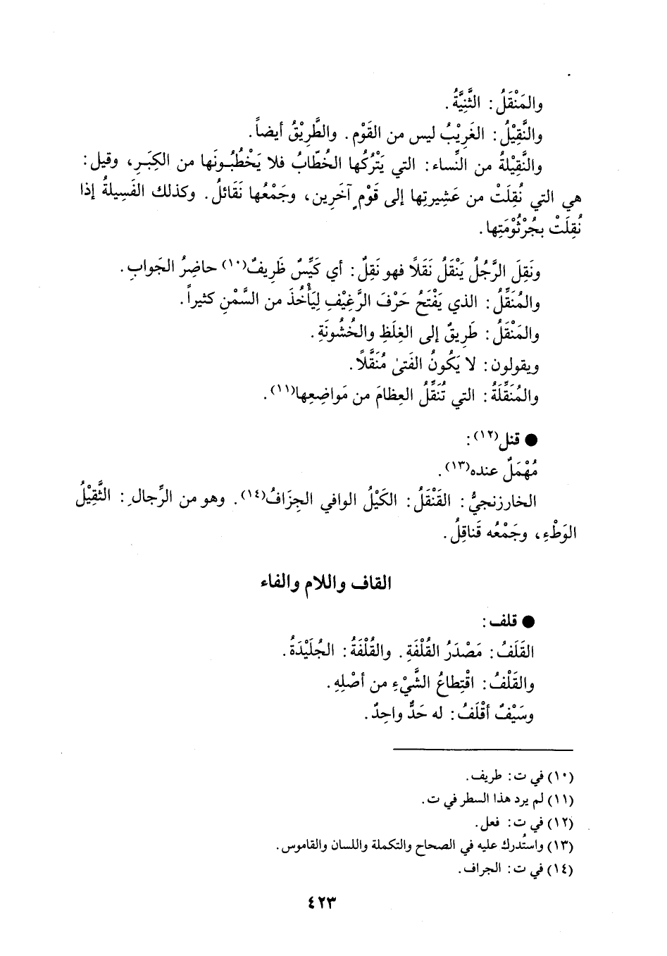 والمَنْقَلُ : الثَّنِيَّةُ . والنَّقِيْلُ : الغَرِيْبُ ليس من القَوْم . والطَّرِيْقُ أيضاً . والنَّقِيْلةُ من النِّساء : التي يَتْرُكُها الخُطّابُ فلا يَخْطُبُونَها من الكِبَرِ ، وقيل : هي التي نُقِلَتْ من عَشِيرتِها إلى قَوْم آخَرِين ، وجَمْعُها نَقَائلُ . وكذلك الفَسِيلةُ إذا نُقِلَتْ بجُرْثُوْمَتِها . ونَقِلَ الرَّجُلُ يَنْقَلُ نَقَلاً فهو نَقِلٌ : أي كَيِّسٌ ظَرِيفٌ حاضرُ الجَوابِ . والمُنَقِّلُ : الذي يَفْتَحُ حَرْفَ الرَّغِيْفِ لِيَأْخُذَ من السَّمْنِ كثيراً . والمَنْقَلُ : طَرِيقٌ إلى الغِلَظِ والخُشُونَةِ . ويقولون : لا يَكُونُ الفَتى مُنَقَّلاً . والمُنَقِّلَةُ : التي تُنَقِّلُ العِظامَ من مَواضِعِها . قنل مُهْمَلٌ عنده . الخارزنجيُّ : القَنْقَلُ : الكَيْلُ الوافي الجِزَافُ . وهو من الرِّجال : الثَّقِيْلُ الوَطْءِ ، وجَمْعُه قَناقِلُ .