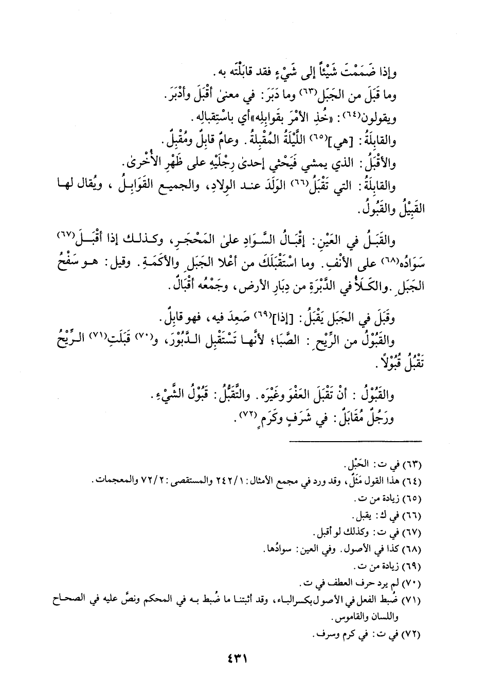وإذا ضَمَمْتَ شَيْئاً إلى شَيْءٍ فقد قابَلْتَه به . وما قَبَلَ من الجَبَل وما دَبَرَ : في معنى أقْبَلَ وأدْبَرَ . ويقولون : ' خُذِ الأمْرَ بقَوابِلِه ' أي باسْتِقبالِه . والقابِلَةُ : هي اللَّيْلَةُ المًقْبِلةُ . وعامٌ قابِلٌ ومُقْبِلٌ . والأقْبَلُ : الذي يمشي فَيَحْثي إحدى رِجْلَيْهِ على ظَهْرِ الأخْرى . والقابِلَةُ : التي تَقْبَلُ الوَلَدَ عند الوِلادِ ، والجميع القَوَابِلُ ، ويُقال لها القَبِيْلُ والقَبُولُ . والقَبَلُ في العَيْنِ : إقْبَالُ السَّوَادِ على المَحْجَرِ ، وكذلك إذا أقْبَلَ سَوَاده على الأنْفِ . وما اسْتَقْبَلَكَ من أعْلى الجَبَل والأكَمَةِ . وقيل : هو سَفْحُ الجَبَل . والكَلأ في الدَّبْرَةِ من دِبَارِ الأرض ، وجَمْعًه أقْبَالٌ . وقَبَلَ في الجَبَل يَقْبَلُ : إذا صَعِدَ فيه ، فهو قابِلٌ . والقَبُوْلُ من الرِّيْح : الصَّبَا ؛ لأنَّها تَسْتَقْبِل الدَّبُوْرَ ، وقَبَلَتِ الرِّيْحُ تَقْبُلُ قُبُوْلاً . والقَبُوْلُ : أنْ تَقْبَلَ العَفْوَ وغَيْرَه . والتَّقَبُّلُ : قَبُوْلُ الشَّيْءِ . ورَجُلٌ مُقَابَلٌ : في شَرَفٍ وكَرَمٍ