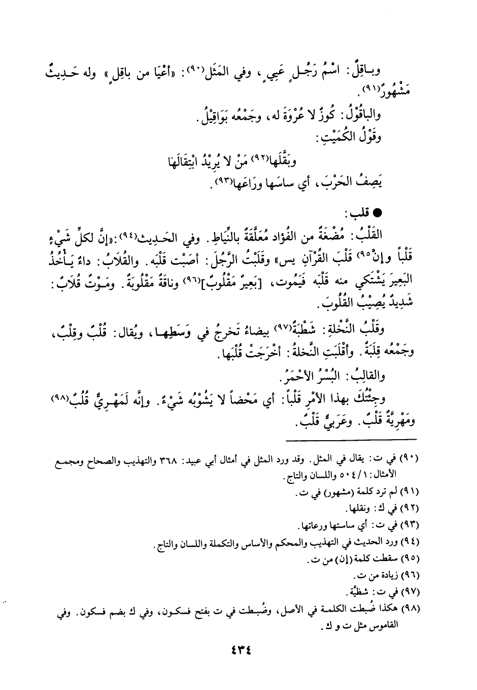 وباقِلٌ : اسْمُ رَجُلٍ عَييٍ ، وفي المَثَل : ' أعْيَا من باقِلٍ ' وله حَدِيث مَشْهُورٌ . والباقُوْلُ : كُوزٌ لا عُرْوَةَ له ، وجَمْعُه بَوَاقِيْلُ . وقَوْلُ الكُمَيْتِ : وبَقَّلَها مَنْ لا يُرِيْدُ ابْتِقَالَها يَصِفُ الحَرْبَ ، أي ساسَها ورَاعَها . قلب القَلْبُ : مُضْغَة من الفُؤاد مُعَلَّقَةٌ بالنِّيَاطِ . وفي الحَدِيث : ' إنَّ لكلِّ شَيْءِ قَلْباً وإن قَلْبَ القُرْآنِ يس ' وقَلَبْتُ الرَّجُلَ : أصبْت قَلْبَه . والقُلابُ : داءٌ يَأْخُذُ البَعِيرَ يَشْتَكي منه قَلْبَه فَيَمُوت ، بَعِيرٌ مَقْلُوبٌ وناقَةٌ مَقْلُوبَةٌ . ومَوْتٌ قلاب : شدِيدٌ يُصِيْبُ القُلُوبَ . وقَلْبُ النَّخْلةِ : شَطْبَةٌ بيضاءُ تَخرجُ في وَسَطِها ، ويُقال : قُلْبٌ وقِلْبٌ ، وجَمْعُه قِلَبَةٌ . وأقْلَبَتِ النَّخلةُ : أخْرَجَتْ قُلْبَها . والقالب : البُسْرُ الأحْمَرً . وجِئْتُكَ بهذا الأمْرِ قَلْباً : أي مَحْضاً لا يَشُوْبُه شَيْءٌ . وإنَّه لَمَهْرِيٌّ قُلُبٌ ومَهْريةٌ قَلْبٌ . وعَرَبيٌّ قَلْبٌ .