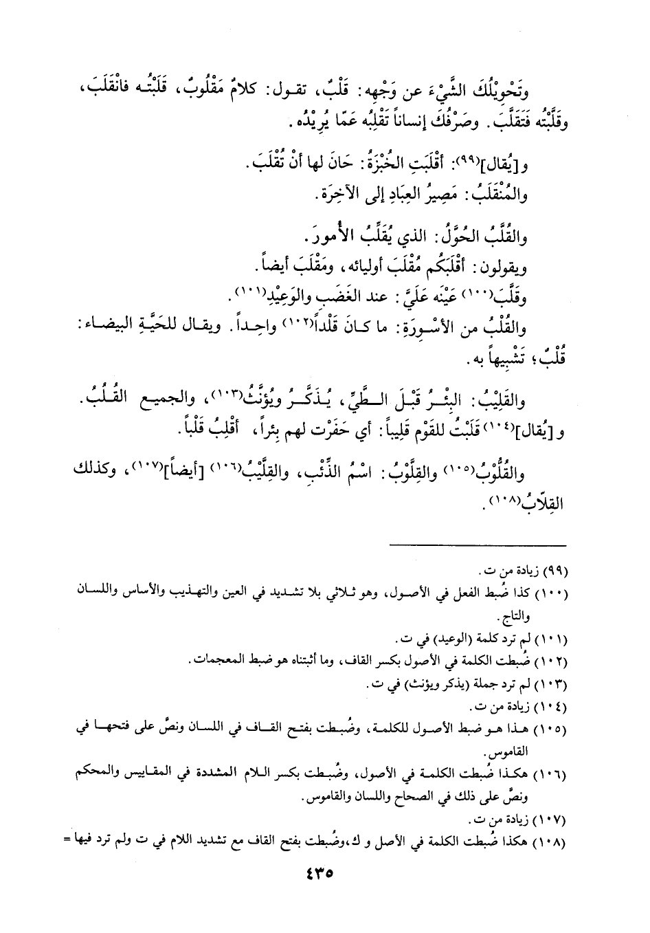 وتَحْوِيْلُكَ الشَّيْءَ عن وَجْهِه : قَلْبٌ ، تقول : كلامٌ مَقْلُوبٌ ، قَلَبْتُه فانْقَلَبَ ، وقَلَّبْتُه فَتَقَلَّبَ . وصَرفكَ إنساناً تَقْلِبُه عَمّا يُرِيْدُه . ويُقال : أقْلَبَتِ الخُبْزَةُ : حَانَ لها أنْ تُقْلَبَ . والمُنْقَلَبُ : مَصِيرُ العِبَادِ إلى الآخرة . والقُلَّبُ الحُوَّلُ : الذي يُقَلِّبُ الأمورَ . ويقولون : أقْلَبَكُم مُقْلَبَ أوليائه ، ومَقْلَبَ أيضاً . وقَلَّبَ عَيْنَه عَلَيَّ : عند الغَضَبِ والوَعِيْدِ . والقُلْبُ من الأسْوِرَةِ : ما كانَ قَلْداً واحِداً . ويقال للحَيَّة البيضاء : قُلْبٌ تَشْبِيهاً به . والقَلِيْبُ : البِئْرُ قَبْلَ الطي ، يُذَكَّرُ وُيؤنَّثُ ، والجميع القُلُب . ويُقال قَلَبْتُ للقَوْم قَلِيباً : أي حَفَرْت لهم بِئراً ، أقْلِبُ قَلْباً . والقُلُّوْبُ والقِلَّوْبُ : اسْمُ الذِّئْبِ ، والقِلَّيْبُ أيضاً ، وكذلك القِلابُ .
