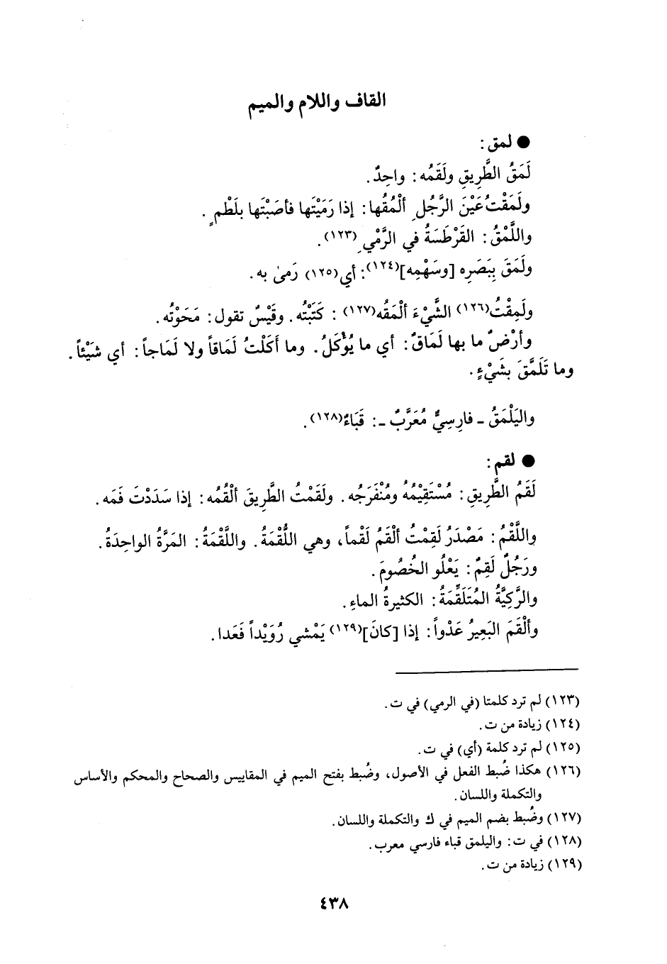 لمق لَمَقُ الطَّرِيقِ ولَقَمُه : واحِدٌ . ولَمَقْتُ عَيْنَ الرَّجُل ألمقُها : إذا رَمَيْتَها فأصَبْتَها بلَطْم . واللَّمْقُ : القَرْطَسَةُ في الرمْي . ولَمَقَ بِبَصَرِه وسَهْمِه : أي رَمى به . ولَمِقْتُ الشَّيْءَ ألْمَقُه : كتبْتُه . وقَيْسٌ تقول : مَحَوْتُه . وأرْضٌ ما بها لمَاقٌ : أي ما يُؤكَلُ . وما أَكَلْتُ لَمَاقاً ولا لمَاجاً : أي شَيْئاً . وما تَلَمَّقَ بشَيْءٍ . واليَلْمَقُ - فارِسِيٌ مُعَرَّبٌ - : قَبَاء . لقم لَقَمُ الطَّرِيقِ : مُسْتَقِيْمُهُ ومُنْفَرَجُه . ولَقَمْتُ الطَّرِيقَ ألْقُمُه : إذا سَدَدْتَ فَمَه . واللَّقْمُ : مَصْدَرُ لَقِمْتُ ألْقَمُ لَقْماً ، وهي اللُّقْمَةُ . واللَّقْمَةُ : المَرَّةُ الواحِدةُ . ورَجُلٌ لَقِمٌ : يَعْلُو الخُصُومَ . والرَّكِيَّةُ المُتَلَقِّمَةُ : الكثيرةُ الماءِ . وألْقَمَ البَعِيرُ عَدْواً : إذا كانَ يَمْشي رُوَيْداً فَعَدا .