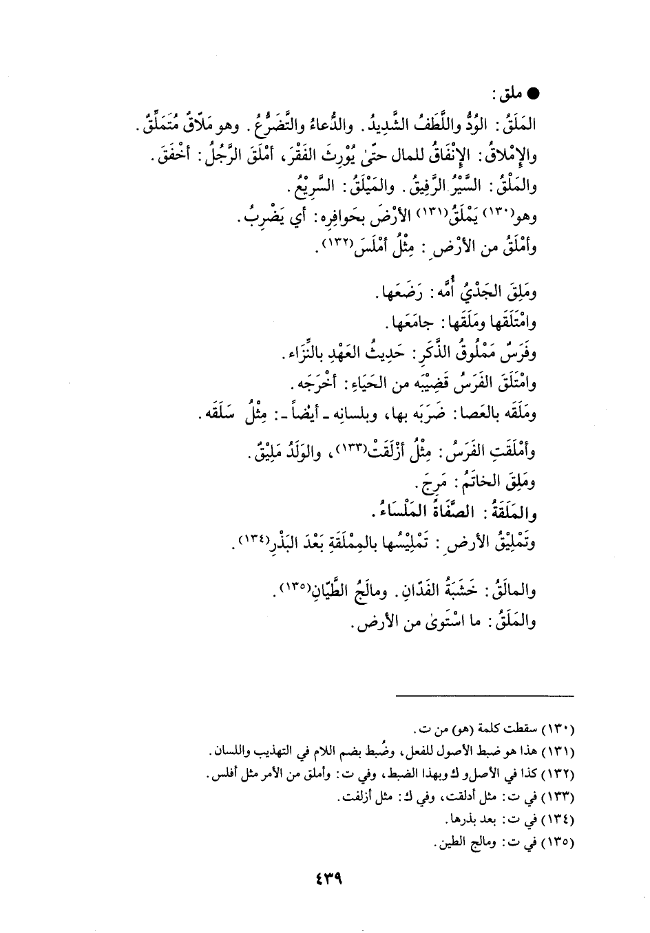 ملق المَلَقُ : الوُدُّ واللَّطَفُ الشَّدِيدُ . والدُّعاءُ والتَّضَرُّعُ . وهو مَلاقٌ مُتمَلِّقٌ . والإِمْلاقُ : الإِنْفَاقُ للمال حتّى يُوْرِثَ الفَقْرَ ، أمْلَقَ الرَّجُلُ : أخْفَقَ . والمَلْقُ : السيْرُ الرَّفِيقُ . والمَيْلَقُ : السَّرِيْعُ . وهو يملق الأرْضَ بحَوافره : أي يضْربُ . وأمْلَقُ من الأرْض : مِثْلُ أمْلَسَ . ومَلِقَ الجَدْيُ أمَّه : رَضَعَها . وامْتَلَقَها ومَلَقَها : جامَعَها . وفَرَسٌ مَمْلُوقُ الذَّكَرِ : حَدِيثُ العَهْدِ بالنِّزَاء . وامْتَلَقَ الفَرَسُ قَضِيْبَه من الحَيَاءِ : أخْرَجَه . ومَلَقَه بالعَصا : ضَرَبَه بها ، وبلسانِه - أيضاً - : مِثْلُ سَلَقَه . وأمْلَقَتِ الفَرَسُ : مِثْلُ أزْلَقَت ، والوَلَدُ مَلِيْقٌ . ومَلِقَ الخاتَمُ : مَرجَ . والمَلَقَةُ : الصَّفَاةُ المَلْسَاءُ . وتَمْلِيْقُ الأرض : تَمْلِيْسُها بالمِمْلَقَةِ بَعْدَ البَذْرِ . والمالَقُ : خَشَبَةُ الفَدّانِ . ومالَجُ الطَّيّانِ والمَلَقُ : ما اسْتَوى من الأرض .