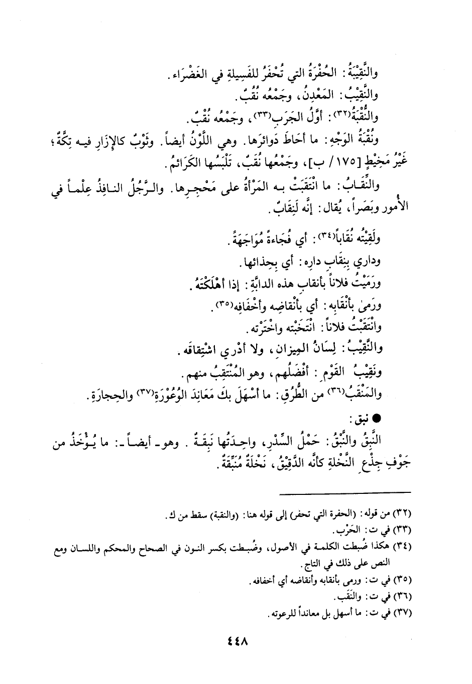 والنًقِيْبَةُ : الحُفْرَةُ التي تُحْفَرُ للفَسِيلةِ في الغَضْرَاء . والنَّقِيْبُ : المَعْدِنُ ، وجَمْعُه نُقُبٌ . والنُّقْبَةُ : أوَّلُ الجَرَبِ ، وجَمْعُه نُقب . ونُقْبَةُ الوَجْهِ : ما أحَاطَ دَوائرَها . وهي اللَّوْنُ أيضَاً . وثَوْبٌ كالإزَارِ فيه تِكَّةٌ ؛ غَيْرُ مَخِيْطٍ ، وجَمْعُها نُقَبٌ ، تَلْبَسُها الكَرَائمُ . والنِّقَابُ : ما انْتَقَبَتْ به المَرْأةُ على مَحْجِرِها . والرَّجُلُ النافِذُ عِلْماً في الأمور وبَصراً ، يُقال : إنَّه لَنِقَابٌ . ولَقِيْتُه نُقَاباً : أي فُجَاءةً مُوَاجَهَةً . وداري بِنِقَابِ دارِه : أي بِحِذائها . ورَمَيْت فلاناً بأنقابِ هذه الدابَّةِ : إذا أهْلَكْتَهُ . ورَمى بأنْقَابِه : أي بأنْقاضِه وأخْفَافِه . وانْتَقَبْتُ فلاناً : انْتَخَبْته واخْتَرْته . والنَّقبُ : لِسَانُ المِيزانِ ، ولا أدْري اشْتِقاقَه . ونَقِيْبُ القَوْم : أفْضَلُهم ، وهو المُنْتَقِبُ منهم . والمنْقَبُ من الطُّرُقِ : ما أسْهَلَ بكَ مَعَانِدَ الوُعُوْرَةِ والحِجارَةِ . نبق النَّبِقُ والنَّبْقُ : حَمْل السِّدْرِ ، واحِدَتُها نَبِقَةٌ . وهو - أيضاً - : ما يؤخَذُ من جَوْفِ جِذْع النَخْلةِ كأنَّه الدَّقِيْقُ ، نَخْلَةٌ مُنَبِّقَةٌ .