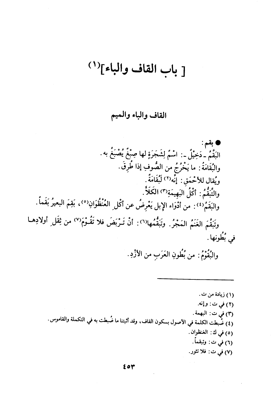 بقم البَقَمُ - دَخِيلٌ - : اسْمٌ لِشَجَرَةٍ لها صِبْغٌ يُصبَغُ به . والبُقَامَةُ : ما يَخْرُجُ من الصُّوفِ إذا طُرِقَ . ويُقال للأحْمَقِ : إنَه لَبُقَامَة . والتَبَقُّمُ : أكْلُ البَهِيمَةِ الكَلأ . والبَقَمُ : من أدوَاء الإِبل يَعْرِضُ عن أكْل العُنْظُوَانِ ، بَقِمَ البعيرُ بَقَماً . وتَبَقَمَ الغَنَمُ المَجْرُ . وتَبَقُّمُها : أنْ تَرْبَضَ فلا تَقُوْمَ من ثِقَل أولادِها في بُطُونها . والبُقُوْمُ : من بُطُونِ العَرَبِ من الأزْدِ .