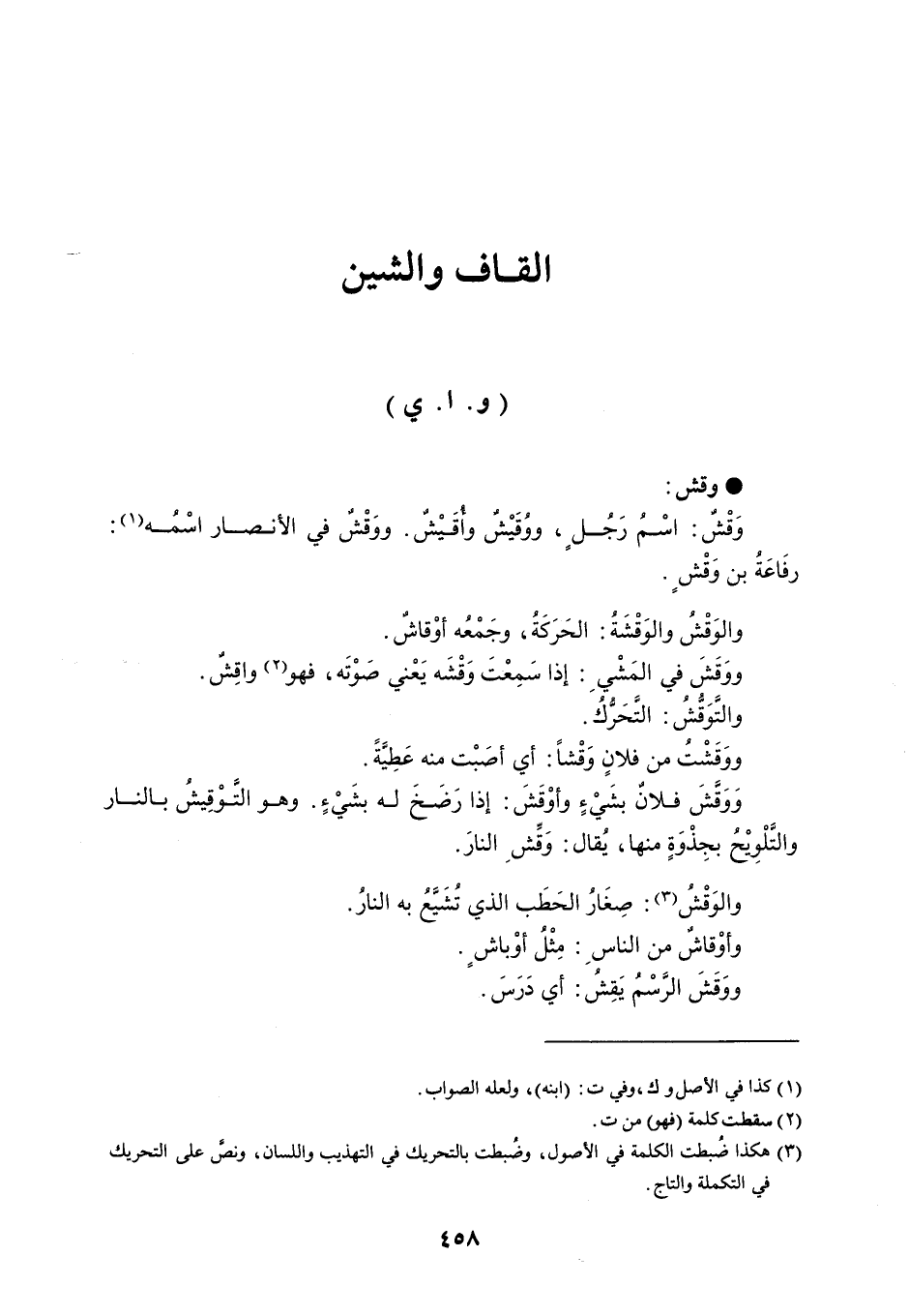 وقش وَقْشٌ : اسْمُ رَجُلٍ ، ووُقَيْشٌ وأقَيْشٌ . ووَقْشٌ في الأنصار اسْمُه : رفاعَةُ بن وَقشٍ . والوَقْشُ والوَقْشَةُ : الحَرَكَةُ ، وجَمْعُه أوْقاشٌ . ووَقَشَ في المَشْي : إذا سَمِعْتَ وَقْشَه يَعْني صَوْتَه ، فهو واقِشٌ . والتَّوَقُّشُ : التَّحَرُّكُ . ووَقَشْتُ من فلانٍ وَقْشاً : أي أصَبْت منه عَطِيِّةً . وَوَقَّشَ فلانٌ بشَيْءٍ وأوْقَشَ : إذا رَضَخَ له بشَيْءٍ . وهو التَّوْقِيشُ بالنار والتِّلْوِيْحُ بجِذْوَةٍ منها ، يُقال : وَقِّش النارَ . والوَقْشُ : صِغَارُ الحَطَب الذي تشَيَّعُ به النارُ . وأوْقاشٌ من الناس : مِثْل أوْباشٍ . ووَقَشَ الرَّسْمُ يَقِشُ : أي دَرَسَ .