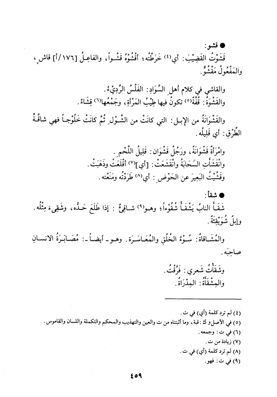 قشو قشَوْتُ القَضِيْبَ : أي خَرَطْتُه ، أقْشُوْه قَشْواً ، والفاعِلُ قاش والمَفْعُولُ مَقْشُوٌّ . والقاشي في كلام أهل السَّوَادِ : الفَلْسُ الرَّديْءُ . والقَشْوُة : قُفَّةٌ تكونُ فيها طِيْبُ المَرْأةِ ، وجَمْعُها قِشَاءٌ . والقَشْوَانَةُ من الإِبل : التي كانَتْ من الشَّوْل ثُمِّ كانَتْ خَلُوْجاً فهي شاقَّةُ الطِّرْقِ : أي قَلِيلُه . وامْرَأةٌ قَشْوَانَةٌ ، ورَجُلٌ قَشْوَان : قَلِيلُ اللَّحْم . وانْقَشَأَتِ السحَابَةُ وانْقَشَعَتْ : أي أقْلَعَتْ وذَهَبَتْ . وقَشَّيْتُ البَعِيرَ عن الحَوْض : أي طَرَدْتُه ومَنَعْته . شقأ شَقَأ النابُ يَشْقَأُ شُقُوْءاً ؛ وهو شاقِئ : إذا طَلَعَ حَدُّه ، وشَقِىءَ مِثْلُه . وإبلٌ شُوَيْقِئَةٌ . والمُشَاقاةُ : لسُوْءُ الخُلُقِ والمُعَاسَرَة . وهو - أيضاً - : مُصَابَرَةُ الانسانِ صاحِبَه . وشَقَأْتُ شَعري : فَرَّقْتُ . والمِشْقَاة : المِدْرَاةُ .