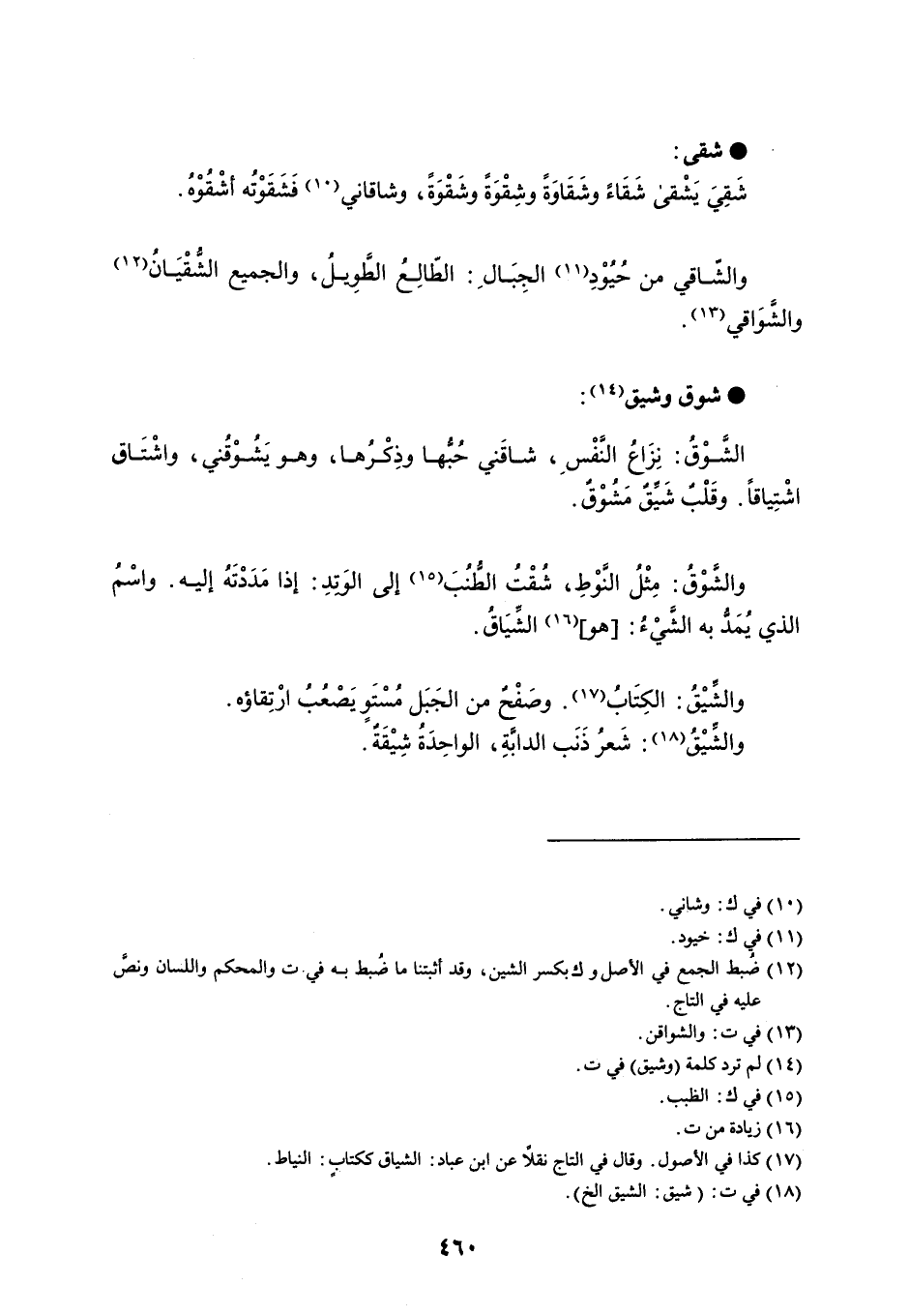 شقى شَقِيَ يَشقى شَقَاءً وشَقَاوَةً وشِقْوَةً وشَقْوَةً ، وشاقاني فَشَقَوته أشْقُوْهُ . والشّاقي من حُيُوْدِ الجِبَال : الطّالِعُ الطَّوِيلُ ، والجميع الشُّقْيَانُ والشَّوَاقي . شوق وشيق الشَّوْقُ : نِزَاعُ النًفْس ، شاقَني حُبها وذِكْرُها ، وهو يَشُوْقُني ، واشْتَاق اشْتِياقاً . وقَلْبٌ شَيِّقٌ مَشُوْقٌ . والشَوْقُ : مِثْلُ النَّوْطِ ، شُقْتُ الطُّنُبَ إلى الوَتدِ : إذا مددْتَهُ إليه . واسْمُ الذي يُمَدُّ به الشَّيْءُ : هو الشِّيَاقُ . والشِّيْقُ : الكِتَابُ . وصَفْحٌ من الجَبَل مُسْتَوٍ يَصْعُبُ ارْتِقاؤه . والشِّيْقُ ؛ شَعرُ ذَنَب الدابَّةِ ، الواحِدَةُ شِيْقَةٌ .