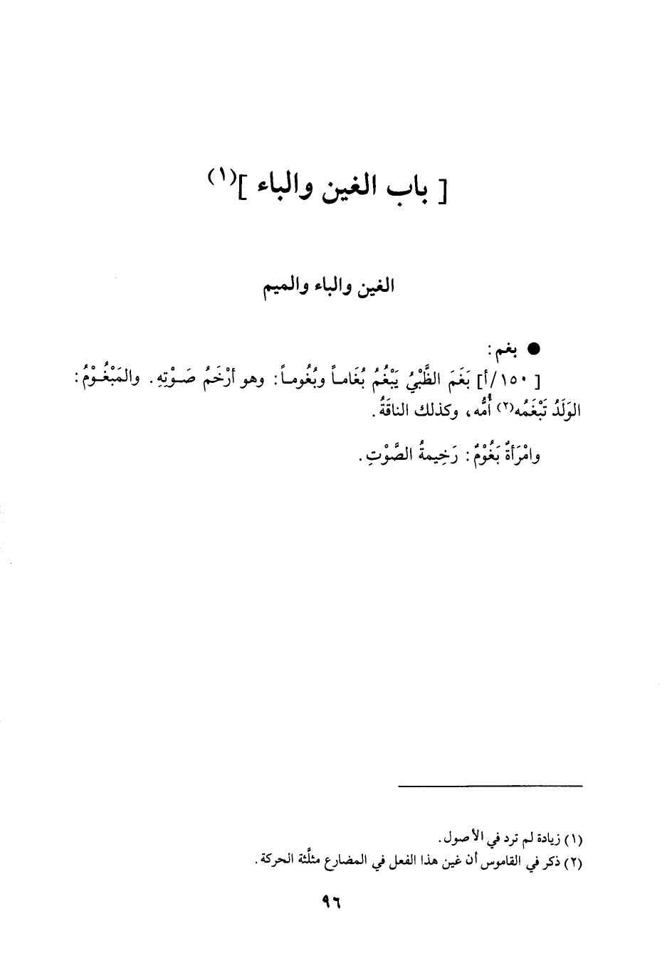 بغم بَغَمَ الظَّبْيُ يَبْغُمُ بُغَاماً وبُغُوماً : وهو أرْخَمُ صوْتهِ . والمَبْغُوْمُ : الوَلَدُ تَبْغَمُه أمًّه ، وكذلك الناقَةُ . وامْرَأةٌ بَغُوْمٌ : رَخِيمةُ الصوْتِ .