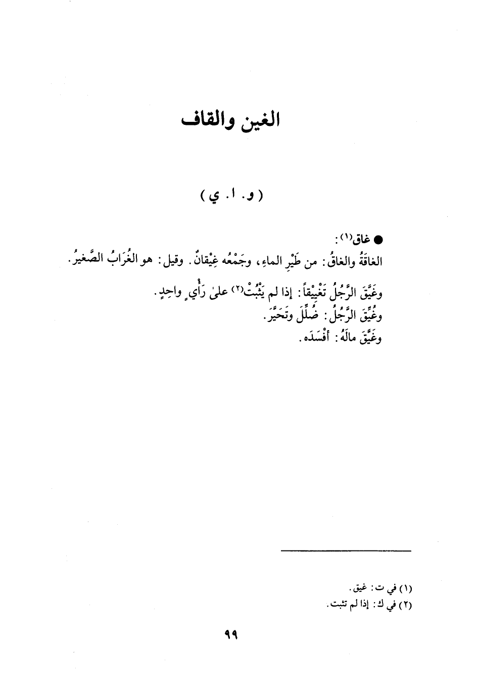 غاق الغاقَةً والغاقُ : من طَيْرِ الماءِ ، وجَمْعُه غِيْقانٌ . وقيل : هو الغُرَاب الصغيرُ . وغيقَ الرِّجُلُ تَغْيِيْقاً : إذا لم يَثْبُتْ على رأيٍ واحِدٍ . وغُيِّقَ الرَّجُلُ : ضُلِّلَ وتَحَيَّرَ . وغَيَّقَ مالَهُ : أفْسَدَ .