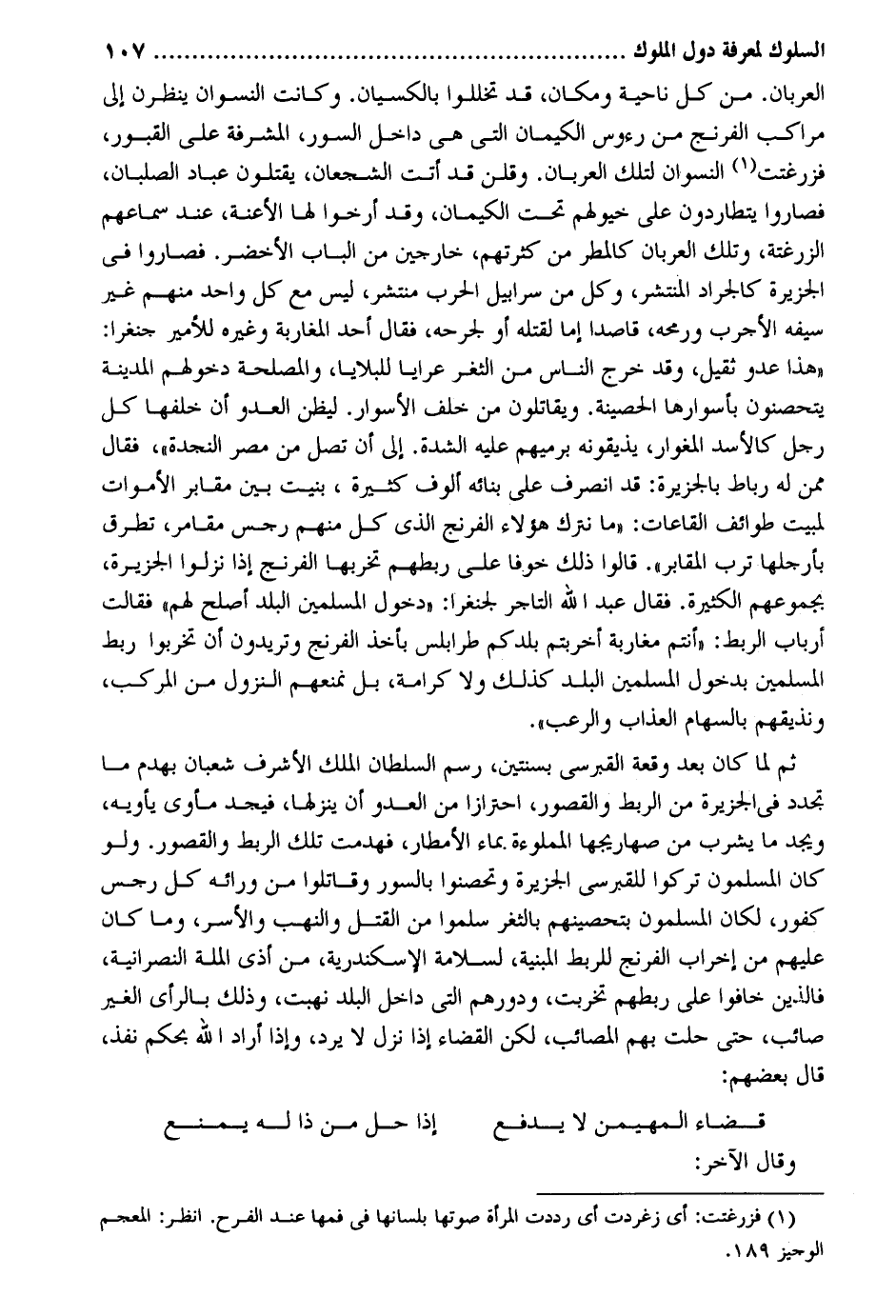 العربان من كل نَاحيَة وَمَكَان قد تخللوا بالكسيان. وَكَانَت النسوان ينظرن إِلَى مراكب الفرنج من رُءُوس الكيمان الَّتِي هِيَ دَاخل السُّور المشرفة على الْقُبُور فزرغتت النسوان لتِلْك العربان. وقلن قد أَتَت الشجعان يقتلُون عباد الصلبان فصاروا يتطاردون على خيولهم تَحت الكيمان وَقد أَرخُوا لَهَا الأعنة عِنْد سماعهم الزرغتة وَتلك العربان كالمطر من كثرتهم خَارِجين من الْبَاب الْأَخْضَر. فصاروا فِي الجزيرة كالجراد الْمُنْتَشِر وكل من سرابيل الْحَرْب منتشر لَيْسَ مَعَ كل وَاحِد مِنْهُم غير سَيْفه الأجرب وَرمحه قَاصِدا إِمَّا لقَتله أَو لجرحه فَقَالَ أحد المغاربة وَغَيره للأمير جنغرا: هَذَا عَدو ثقيل وَقد خرج النَّاس من الثغر عرايا للبلايا والمصلحة دُخُولهمْ الْمَدِينَة يتحصنون بأسوارها الحصينة. ويقاتلون من خلف الأسوار. ليظن الْعَدو أَن خلفهَا كل رجل كالأسد المغوار يذيقونه برميهم عَلَيْهِ الشدَّة. إِلَى أَن تصل من مصر النجحة فَقَالَ مِمَّن لَهُ رِبَاط بالجزيرة: قد انْصَرف على بنائِهِ أُلُوف كَثِيرَة بنيت بَين مَقَابِر الْأَمْوَات لمبيت طوائف القاعات: مَا نَتْرُك هَؤُلَاءِ الفرنج الَّذِي كل مِنْهُم رِجْس مقامر تطرق بأرجلها ترب الْمَقَابِر. قَالُوا ذَلِك خوفًا على ربطهم تخربها الفرنج إِذا نزلُوا الجزيرة بجموعهم الْكَثِيرَة. فَقَالَ عبد الله التَّاجِر لجنغرا: دُخُول الْمُسلمين الْبَلَد أصلح لَهُم فَقَالَت أَرْبَاب الرَّبْط: أَنْتُم مغاربة أخربتم بلدكم طرابلس بِأخذ الفرنج وتريدون أَن تخربوا ربط الْمُسلمين بِدُخُول الْمُسلمين الْبَلَد كَذَلِك وَلَا كَرَامَة بل نمنعهم النُّزُول من الْمركب نذيقهم بِالسِّهَامِ الْعَذَاب والرعب. ثمَّ لما كَانَ بعد وقْعَة القبرسي بِسنتَيْنِ رسم السُّلْطَان الْملك الْأَشْرَف شعْبَان بهدم ماتجده فِي الجزيرة من الرَّبْط والقصور احْتِرَازًا من الْعَدو أَن ينزلها فيجد مأوى يأويه ويجد مَا يشرب من صهاريجها المملوءة. بِمَاء الأمطار فهدمت تِلْكَ الرَّبْط والقصور. وَلَو كَانَ تركُوا للقبرسي الجزيرة وتحصنوا بالسور وقاتلوا من وَرَائه كل رِجْس كفور لَكَانَ الْمُسلمُونَ بتحصينهم بالثغر سلمُوا من الْقَتْل والنهب والأسر وَمَا كَانَ عَلَيْهِم من إخراب الفرنج للربط المبينة لِسَلَامَةِ الْإسْكَنْدَريَّة من أَذَى الْملَّة النَّصْرَانِيَّة فَالَّذِينَ خَافُوا على ربطهم تخربت ودورهم الَّتِي دَاخل الْبَلَد نهبت وَذَلِكَ بِالرَّأْيِ الْغَيْر صائب حَتَّى حلت بهم المصائب لَكِن الْقَضَاء إِذا نزل لَا يرد وَإِذا أَرَادَ الله بِحكم نفذ قَالَ بَعضهم قَضَاء الْمُهَيْمِن لايدفع إِذا حل من ذَا لَهُ يمْنَع وَقَالَ الآخر