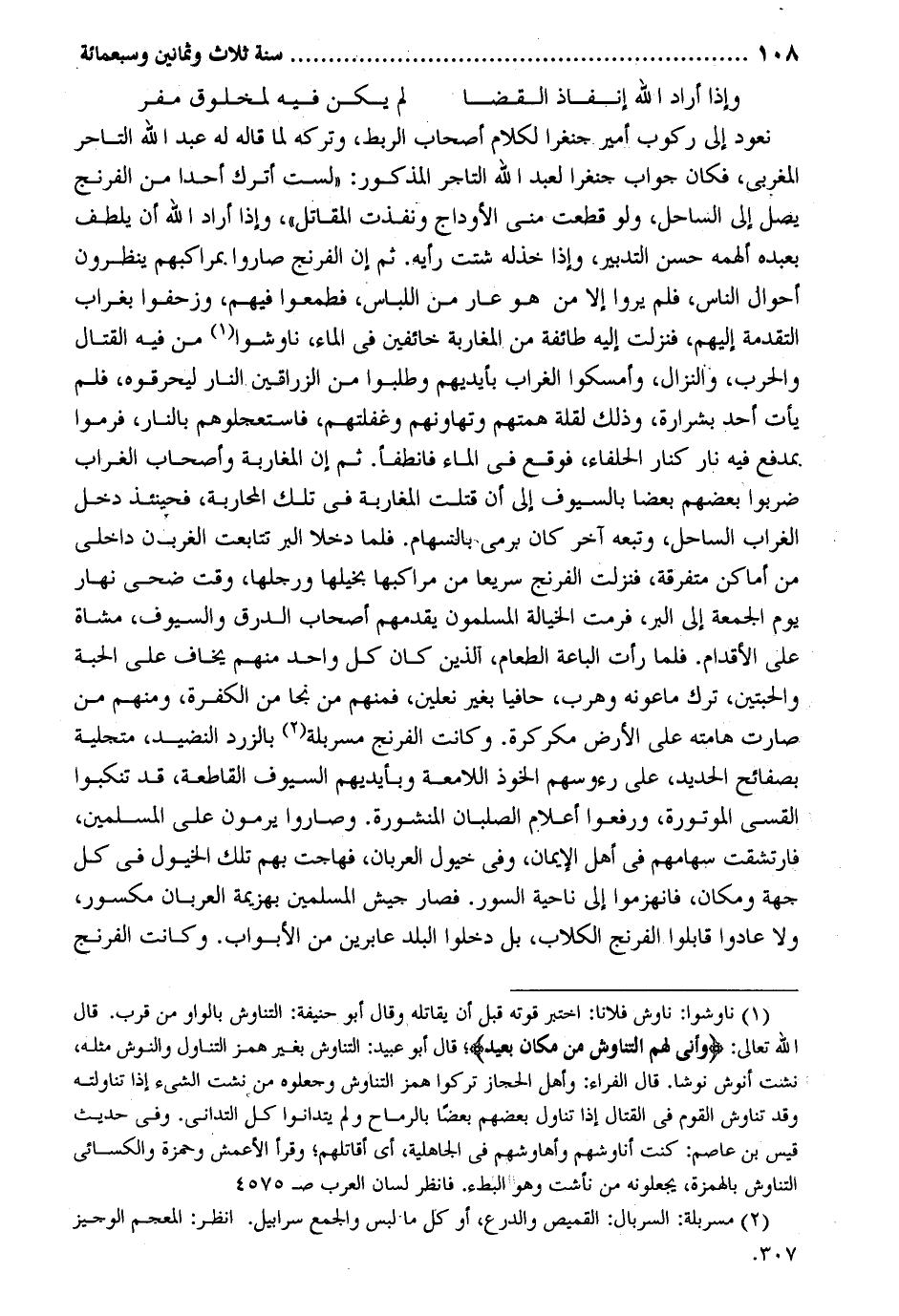 وَإِذا أَرَادَ الله إِنْفَاذ القضا لم يكن فِيهِ لمخلوق مفر نعود إِلَى ركُوب أَمِير جنغرا لكَلَام أَصْحَاب الرَّبْط وَتَركه لما قَالَه لَهُ عبد الله التَّاجِر المغربي فَكَانَ جَوَاب جنغرا لعبد الله التَّاجِر الْمَذْكُور: لست أترك أحدا من الفرنج يصل إِلَى السَّاحِل وَلَو قطعت مني الْأَوْدَاج ونفذت الْمقَاتل وَإِذا أَرَادَ الله أَن يلطف بِعَبْدِهِ ألهمه حسن التَّدْبِير وَإِذا خذله شتت رَأْيه. ثمَّ إِن الفرنج صَارُوا. بمراكبهم ينظرُونَ أَحْوَال النَّاس فَلم يرَوا إِلَّا من هُوَ عَار من اللبَاس فطمعوا فيهم وزحفوا بغراب التقدمة إِلَيْهِم فَنزلت إِلَيْهِ طَائِفَة من المغاربة خَائِفين فِي المَاء ناوشوا من فِيهِ الْقِتَال وَالْحَرب و. النزال وأمسكوا الْغُرَاب بِأَيْدِيهِم وطلبوا من الزراقين النَّار ليحرقوه فَلم يَأْتِ أحد بشرارة وَذَلِكَ لقلَّة همتهم وتهاونهم وغفلتهم فاستعجلوهم بالنَّار فرموا. بمدفع فِيهِ نَار كنار الحلفاء فَوَقع فِي المَاء فانطفأ. ثمَّ إِن المغاربة وَأَصْحَاب الْغُرَاب ضربوا بَعضهم بَعْضًا بِالسُّيُوفِ إِلَى أَن قتلت المغاربة فِي تِلْكَ الْمُحَاربَة فَحِينَئِذٍ دخل الْغُرَاب السَّاحِل وَتَبعهُ آخر كَانَ يَرْمِي بِالسِّهَامِ. فَلَمَّا دخلا الْبر تَتَابَعَت الْغرْبَان داخلي من أَمَاكِن مُتَفَرِّقَة فَنزلت الفرنج سَرِيعا من مراكبها بخيلها ورجالها وَقت ضحى نَهَار يَوْم الْجُمُعَة إِلَى الْبر فرمت الخيالة الْمُسلمُونَ يقدمهم أَصْحَاب الدرق وَالسُّيُوف مشَاة على الْأَقْدَام. فَلَمَّا رَأَتْ الباعة الطَّعَام الَّذين كَانَ كل وَاحِد مِنْهُم يخَاف على الْحبَّة والحبتين ترك ماعونه وهرب حافيا بِغَيْر نَعْلَيْنِ فَمنهمْ من نجا من الْكَفَرَة وَمِنْهُم من صَارَت هامته على الأَرْض مكركرة. وَكَانَت الفرنج مسربلة بالزرد النضيد متجلية بصفائح الْحَدِيد على رُءُوسهم الخوذ اللامعة وبأيديهم السيوف القاطعة قد تنكبوا القسي المولَودة ورفعواأعلام الصلبان المنشورة. وصاروا يرْمونَ على الْمُسلمين فارتشقت سِهَامهمْ فِي أهل الْإِيمَان وَفِي خُيُول العربان فهاجت بهم تِلْكَ الْخُيُول فِي كل جِهَة وَمَكَان فَانْهَزَمُوا إِلَى نَاحيَة السُّور. فَصَارَ جَيش الْمُسلمين بهزيمة العربان مكسور وَلَا عَادوا قابلوا الفرنج الْكلاب بل دخلُوا الْبَلَد عابرين من الْأَبْوَاب. وَكَانَت الفرنج