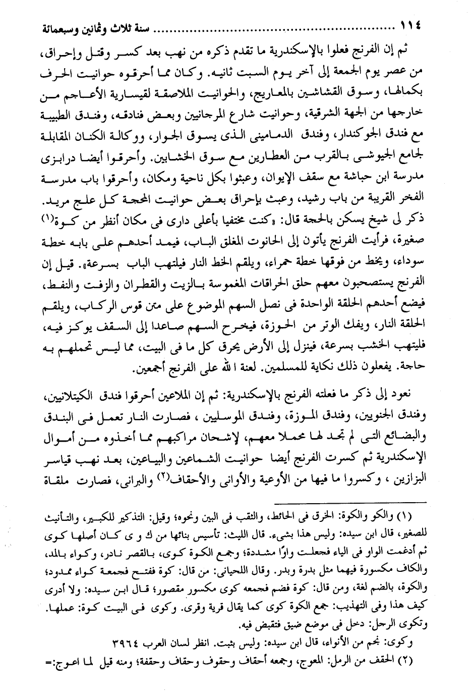 ثمَّ إِن الفرنج فعلوا بالإسكندرية مَا تقدم ذكره من نهب بعد كسر وَقتل وإحراق من عصر يَوْم الْجُمُعَة إِلَى أخر يَوْم السبت ثَانِيه. وَكَانَ مِمَّا أحرقوه حوانيت الْحَرْف بكمالها وسوق القشاشين بالمعاريج والحوانيت الملاصقة لقيسارية الْأَعَاجِم من خَارِجهَا من الْجِهَة الشرقية وحوانيت شَارِع المرجانيين وَبَعض فنادقه وفندق الطبيبة مَعَ فندق الجوكندار وفندق الدماميني الَّذِي يَسُوق الْجوَار ووكالة الكنان الْمُقَابلَة لجامع الجيوشي بِالْقربِ من العطارين مَعَ سوق الخشابين. وأحرقوا أَيْضا درابزي مدرسة ابْن حُبَاشَة مَعَ سقف الإيوان وعبثوا بِكُل نَاحيَة وَمَكَان وأحرقوا بَاب مدرسة الْفَخر الْقَرِيبَة من بَاب رشيد وعبث بإحراق بعض حوانيت المحجة كل علج مُرِيد. ذكر لي شيخ يسكن بِالْحجَّةِ قَالَ: كنت مختفيا بِأَعْلَى دَاري فِي مَكَان أنظر من كوَّة صَغِيرَة فَرَأَيْت الفرنج يأْتونَ إِلَى الْحَانُوت المغلق الْبَاب فيمد أحدهم على بَابه خطة سَوْدَاء ويخط من فَوْقهَا خطة حَمْرَاء ويلقم الْخط النَّار فيلتهب الْبَاب بِسُرْعَة قيل إِن الفرنج يستصحبون مَعَهم حلق الحراقات المغموسة بالزيت والقطران والزفت والنفط فَيَضَع أحدهم الْحلقَة الْوَاحِدَة فِي نصل السهْم الْمَوْضُوع على متن قَوس الركاب ويلقم الْحلقَة النَّار ويفك الْوتر من الْحَوْزَة فيخرح السهْم صاعداً إِلَى السّقف يوكز فِيهِ فليتهب الْخشب بِسُرْعَة فَينزل إِلَى الأَرْض يحرق كل مَا فِي الْبَيْت مِمَّا لَيْسَ تحملهم بِهِ حَاجَة. يَفْعَلُونَ ذَلِك نكاية للْمُسلمين. لعنة الله على الفرنج أَجْمَعِينَ. نعود إِلَى ذكر مَا فعلته الفرنج بالإسكندرية: ثمَّ إِن الملاعين أحرقوا فندق الكيتلانيين وفندق الجنويين وفندق الموزة وفندق الموسليين فَصَارَت النَّار تعْمل فِي البندق والبضائع الَّتِي لم تَجِد لَهَا محملًا مَعَهم لإشحان مراكبهم مِمَّا أَخَذُوهُ من أَمْوَال الْإسْكَنْدَريَّة ثمَّ كسرت الفرنج أَيْضا حوانيت الشماعين والبياعين بعد نهب قياسر البزازين وكسروا مَا فِيهَا من الأوعية والأواني والأحقاف والبراني فَصَارَت ملقاة