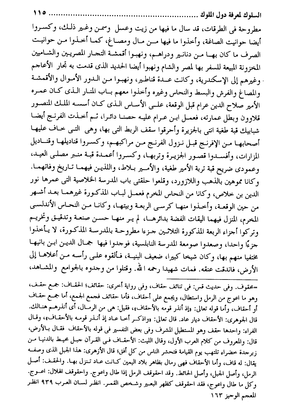 مطروحة فِي الطرقات قد سَالَ مَا فِيهَا من زَيْت وَعسل وَسمن وَغير ذَلِك وكسروا أَيْضا حوانيت الصاغة وَأخذُوا مَا فِيهَا من مَال ومصاغ كَمَا أخذُوا من حوانيت الصّرْف مَا كَانَ بهَا من دَنَانِير ودراهم ونهبوا أقمشة التُّجَّار المصريين والشاميين المخزونة الْمَبِيعَة للسَّفر بهَا لمصر وَالشَّام ونهبوا أَيْضا الْحَدِيد الَّذِي قدمت بِهِ تجار الْأَعَاجِم وَغَيرهم إِلَى الْإسْكَنْدَريَّة وَكَانَت عدَّة قناطير ونهبوا من الدّور الْأَمْوَال والأقمشة والمصاغ والفرش والبسط والنحاس وَغَيره وَأخذُوا مَعَهم بَاب الْمنَار الَّذِي كَانَ عمره الْأَمِير صَلَاح الدّين عرام قبل الْوَقْعَة على الأساس الَّذِي كَانَ أسسه الْملك الْمَنْصُور قلاوون وَبَطل عِمَارَته فَعمل ابْن عرام عَلَيْهِ حصنا دائراً ثمَّ أخذت الفرنج أَيْضا شبابيك قبَّة طغية انتي بالجزيرة وأحرقوا سقف الرَّبْط الَّتِي بهَا وَهِي الَّتِي خَافَ عَلَيْهَا أَصْحَابهَا من الإفرنج قبل نزُول الفرنج من مراكبهم وكسروا قناديلها وقناديل المزارات وأفسدوا قُصُور الجزيرة وتربها وكسروا أعمدة قبَّة مِنْبَر مصلى الْعِيد وعمودي ضريح قبَّة تربة الْأَمِير طغية والأمير بلاط واللذين فيهمَا تَارِيخ وفاتهما. وَكَانَا مموهين بِالذَّهَب واللازورد وقلعوا حلقتي بَاب الْمدرسَة الخلاصية الَّتِي عمرها نور الدّين بن خلاص وَكَانَا من النّحاس المخرم فَعمل لباب الْمَذْكُورَة غَيرهمَا بعد أشهر من حِين الْوَقْعَة وَأخذُوا مِنْهَا كرْسِي الربعة وبيتها وَكَانَا من النّحاس الأندلسي المخرم الْمنزل فيهمَا اليقات الْفضة بدائرها لم ير مِنْهَا حسن صَنْعَة وتدقيق وتخريم وَتركُوا أَجزَاء الربعة الْمَذْكُورَة الثَّلَاثِينَ جُزْءا مطروحة بِالْمَدْرَسَةِ الْمَذْكُورَة لَا يَأْخُذُوا جُزْءا وَاحِدًا وصعدوا صومعة الْمدرسَة النابلسية فوجدوا فِيهَا جمال الدّين ابْن بانيها مختفيا مِنْهُم بهَا وَكَانَ شَيخا كَبِيرا ضَعِيف البنية فألقوه على رَأسه من أَعْلَاهَا إِلَى الأَرْض فاندقت عُنُقه. فَمَاتَ شَهِيدا رَحمَه الله. وَقتلُوا من وجدوه بالجوامع والمشاهد